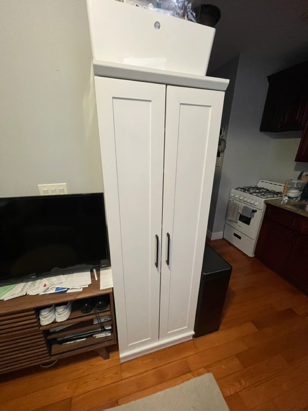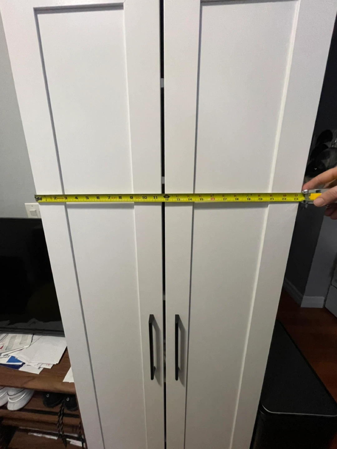 This tall white storage cabinet offers ample space for organization. It has adjustable shelves and two doors with black handles. Measurements: 70 inches tall, 16 inches deep, and 24 inches wide. It's great for storing linens, pantry items, or cleaning supplies!