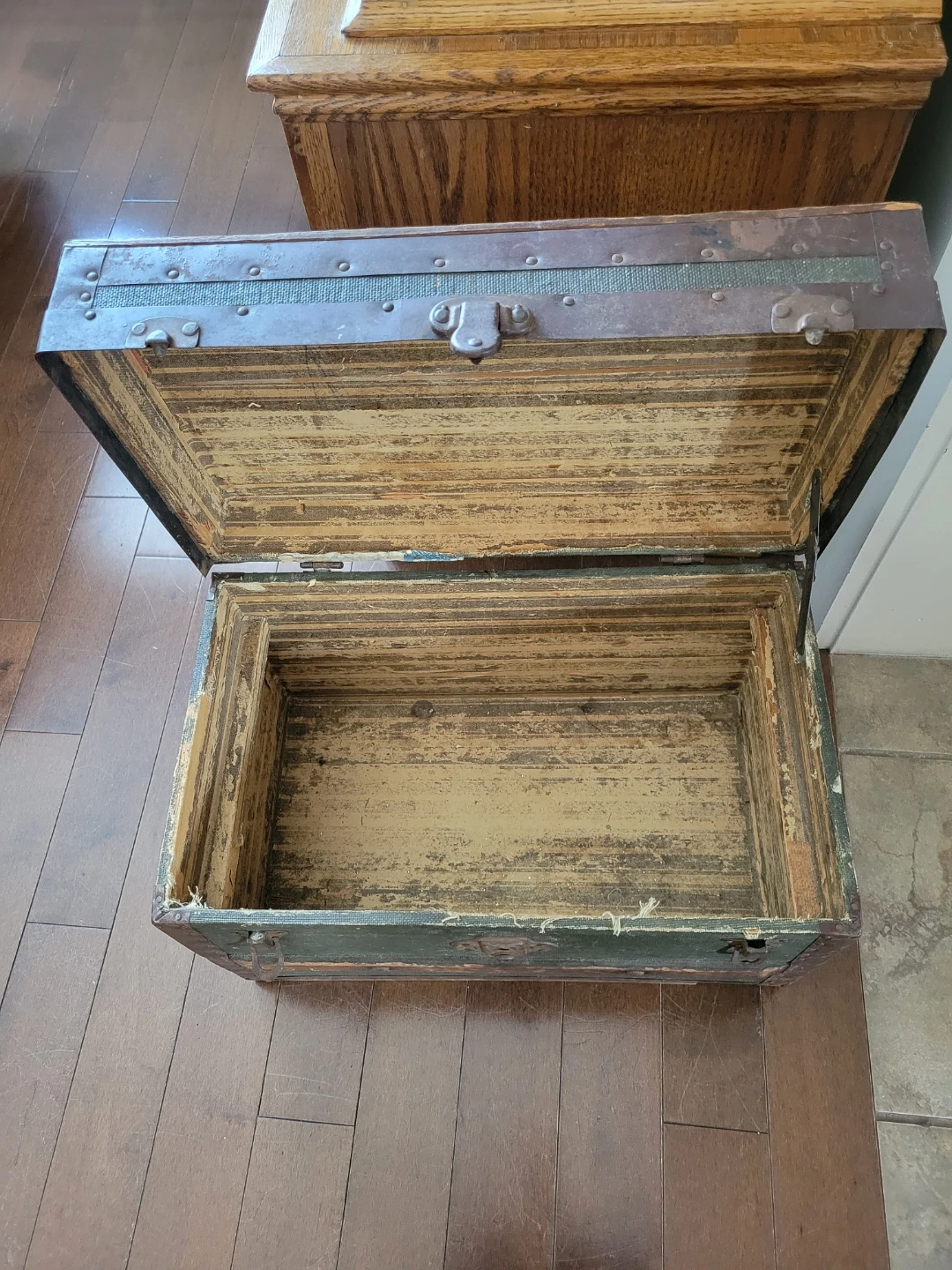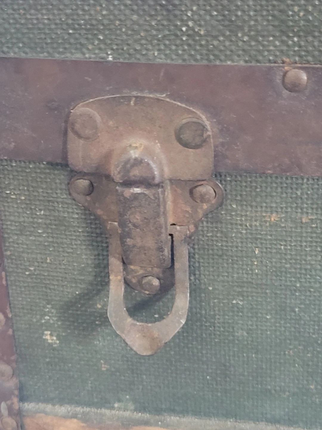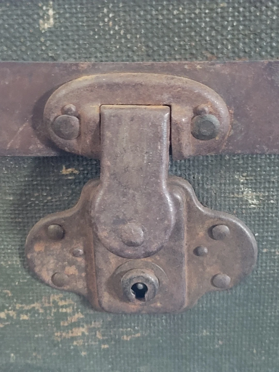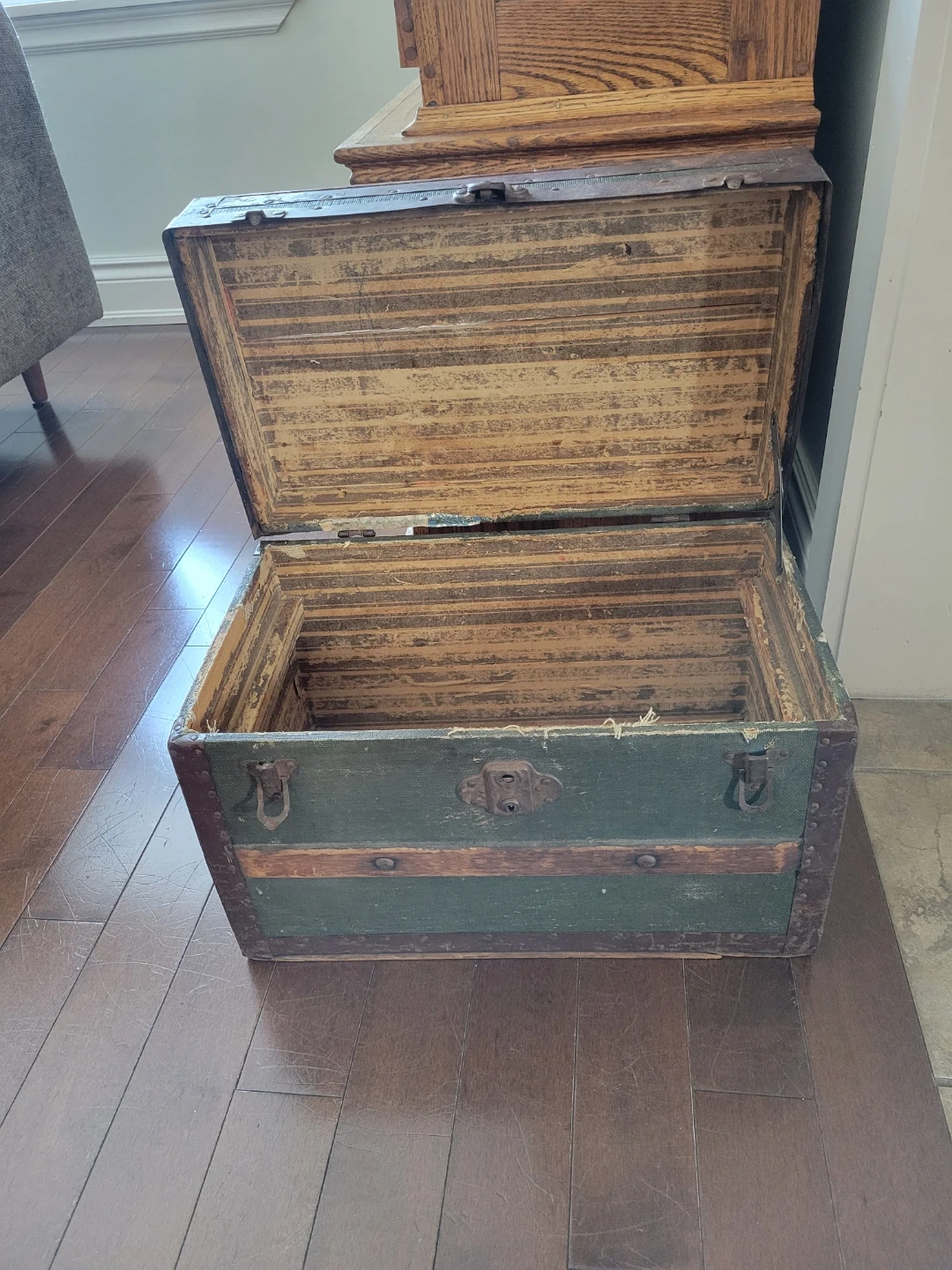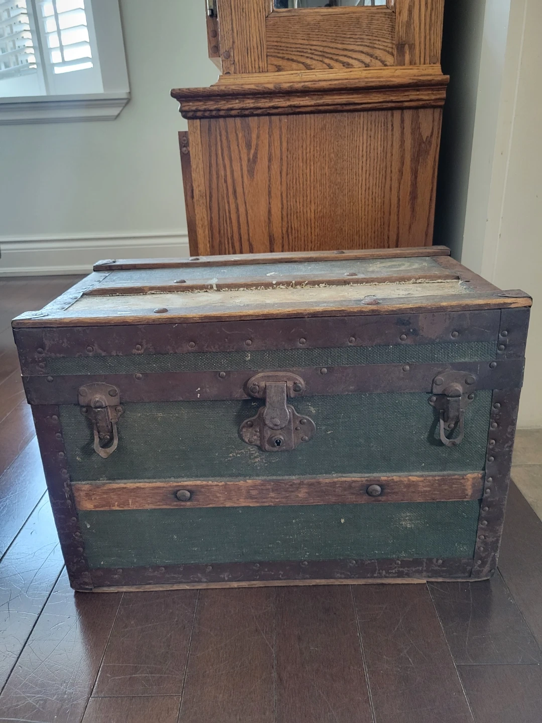 This used vintage trunk is a unique piece, perfect for adding a touch of rustic charm to your home decor or for use as a prop; though it shows signs of age, it retains its structural integrity and vintage appeal.
