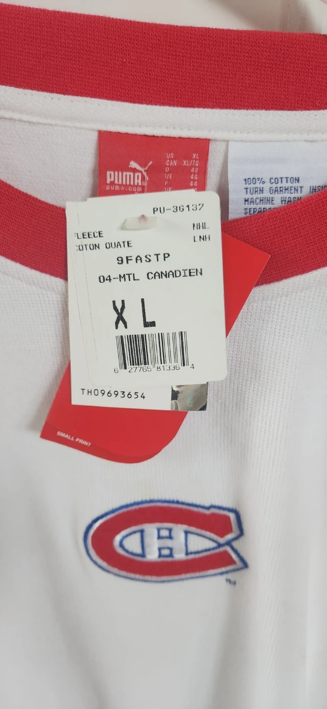 Puma fleece sweatshirt featuring the Montreal Canadiens logo and "Montreal 66" on the back. 100% cotton material. Machine wash cold inside out. Made in a regular fit.