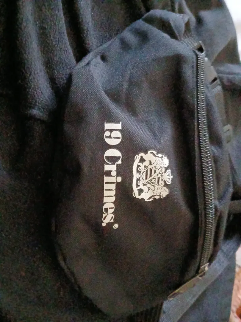 This is a black fanny pack with the "19 Crimes" logo. It features a zippered pocket. It's a great way to carry essentials hands-free.