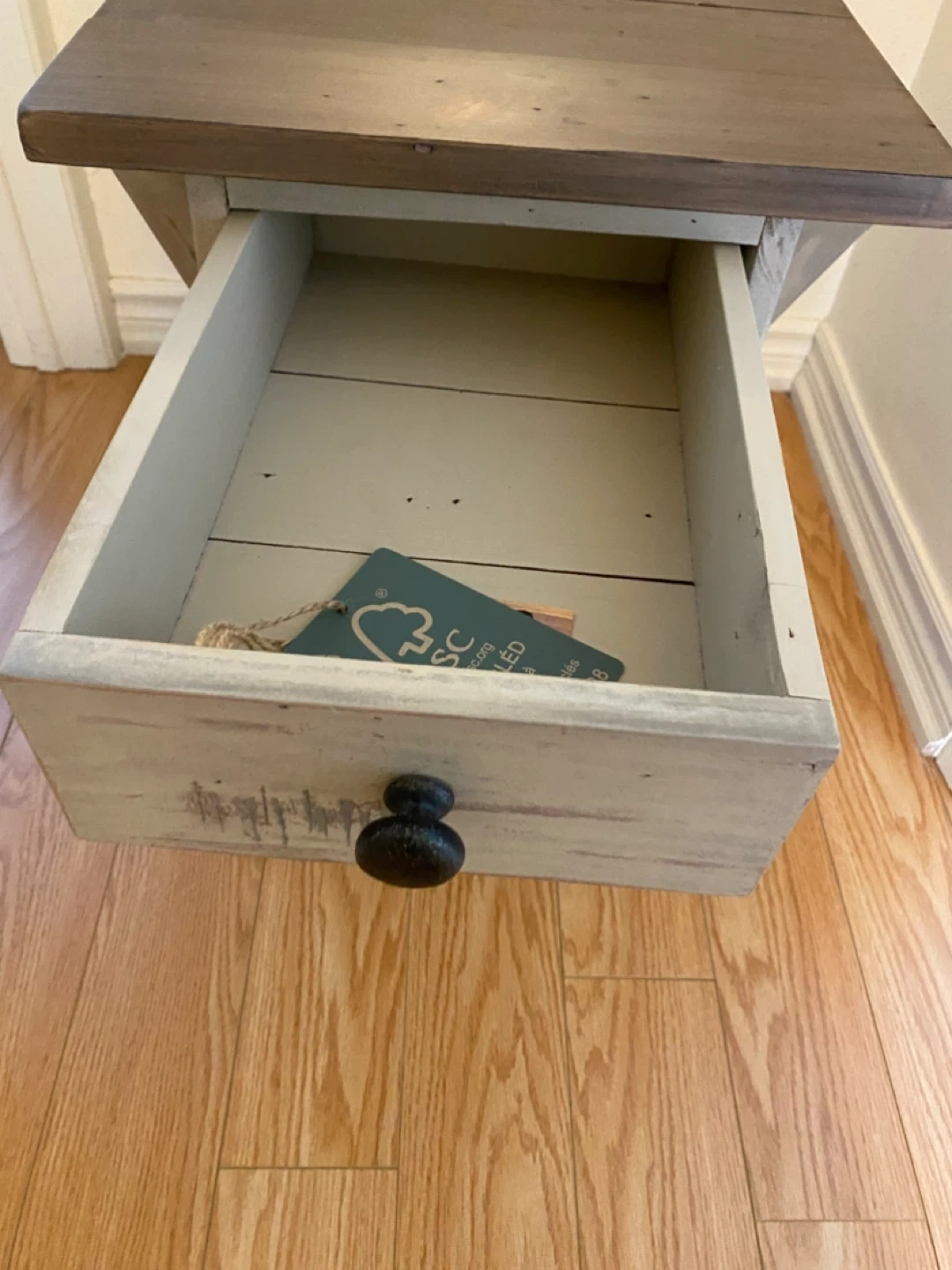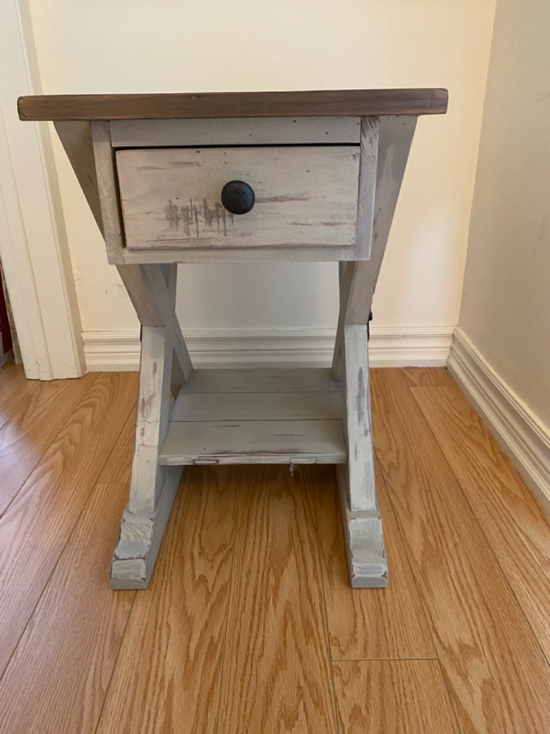 This end table features a rustic, distressed wood finish with a gray-washed frame. It has a single drawer with a dark knob and an open shelf below. Its construction includes an X-frame design for added stability.