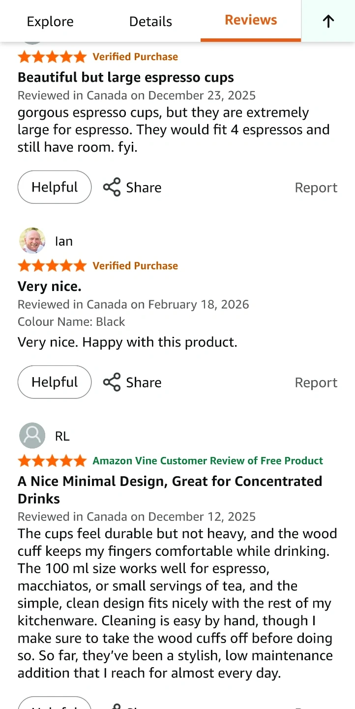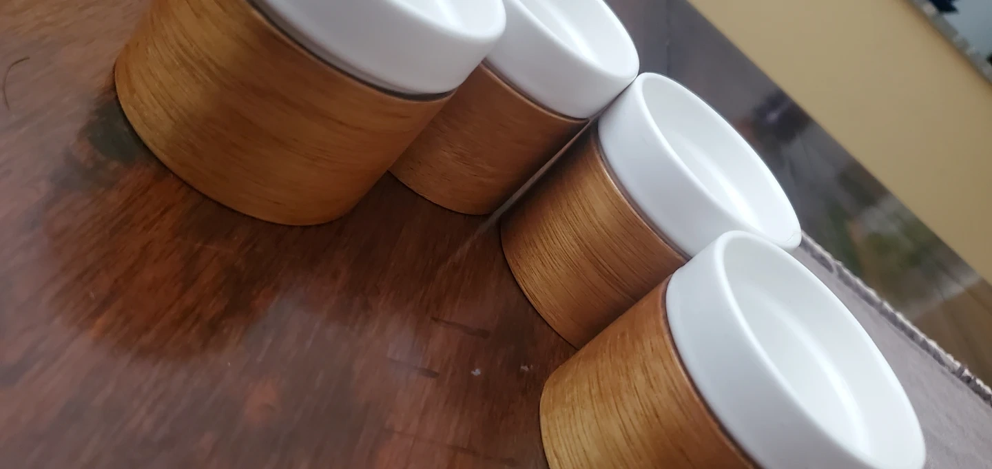 Set of 4 MIAMIO espresso cups in stoneware ceramic with removable wooden cuffs. Each cup holds 100 ml and is 3 oz. These cups are safe to handle and have a simple, clean design.