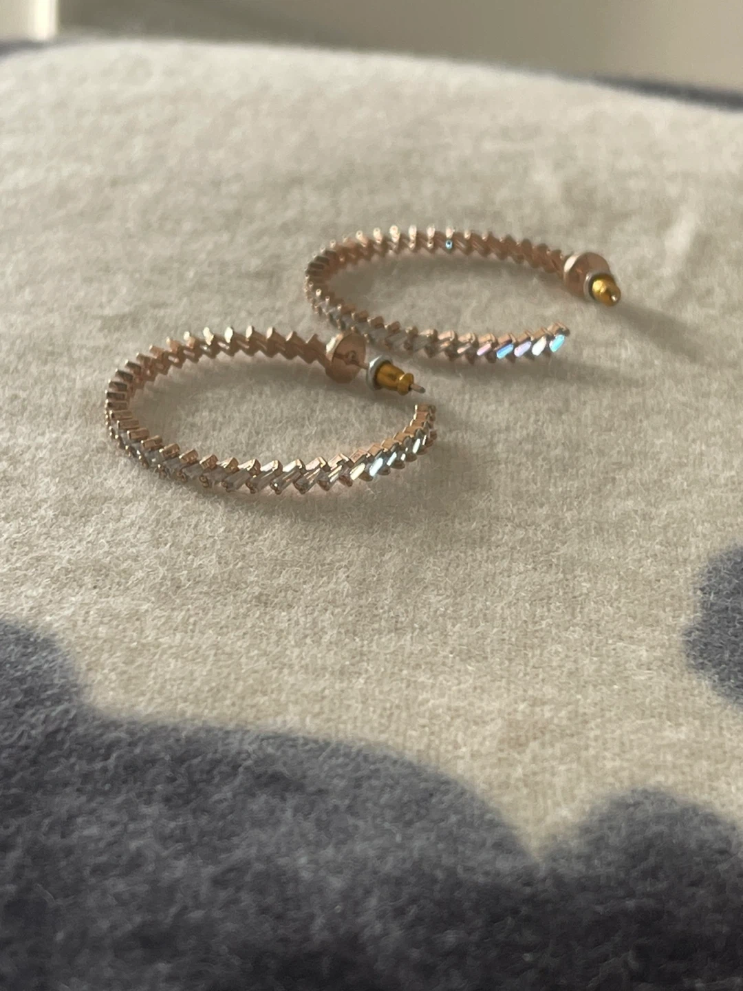 These rose gold hoop earrings are adorned with sparkling rhinestones. They feature a unique textured design along the hoop. Perfect for adding a touch of glamour to any outfit!
