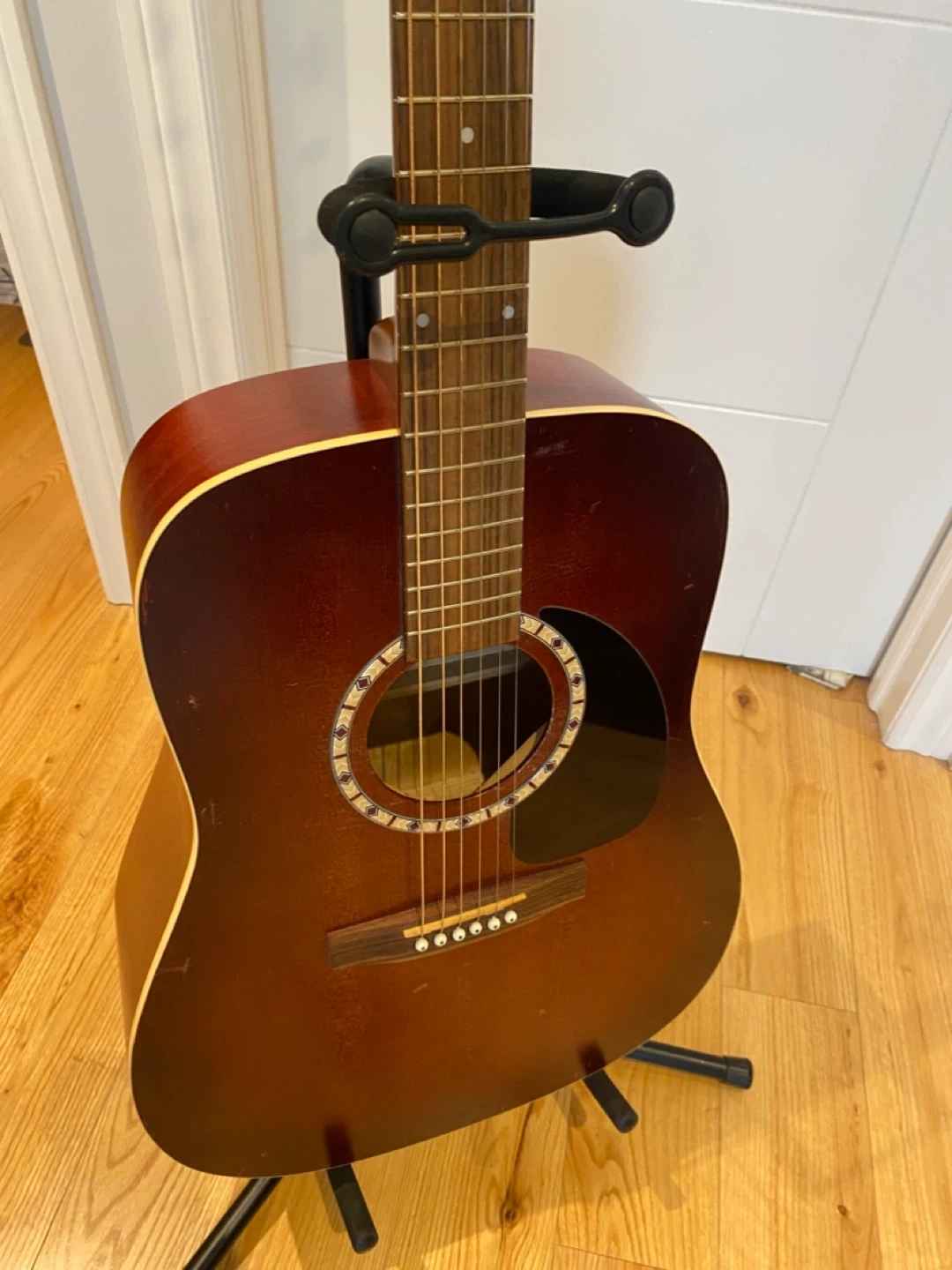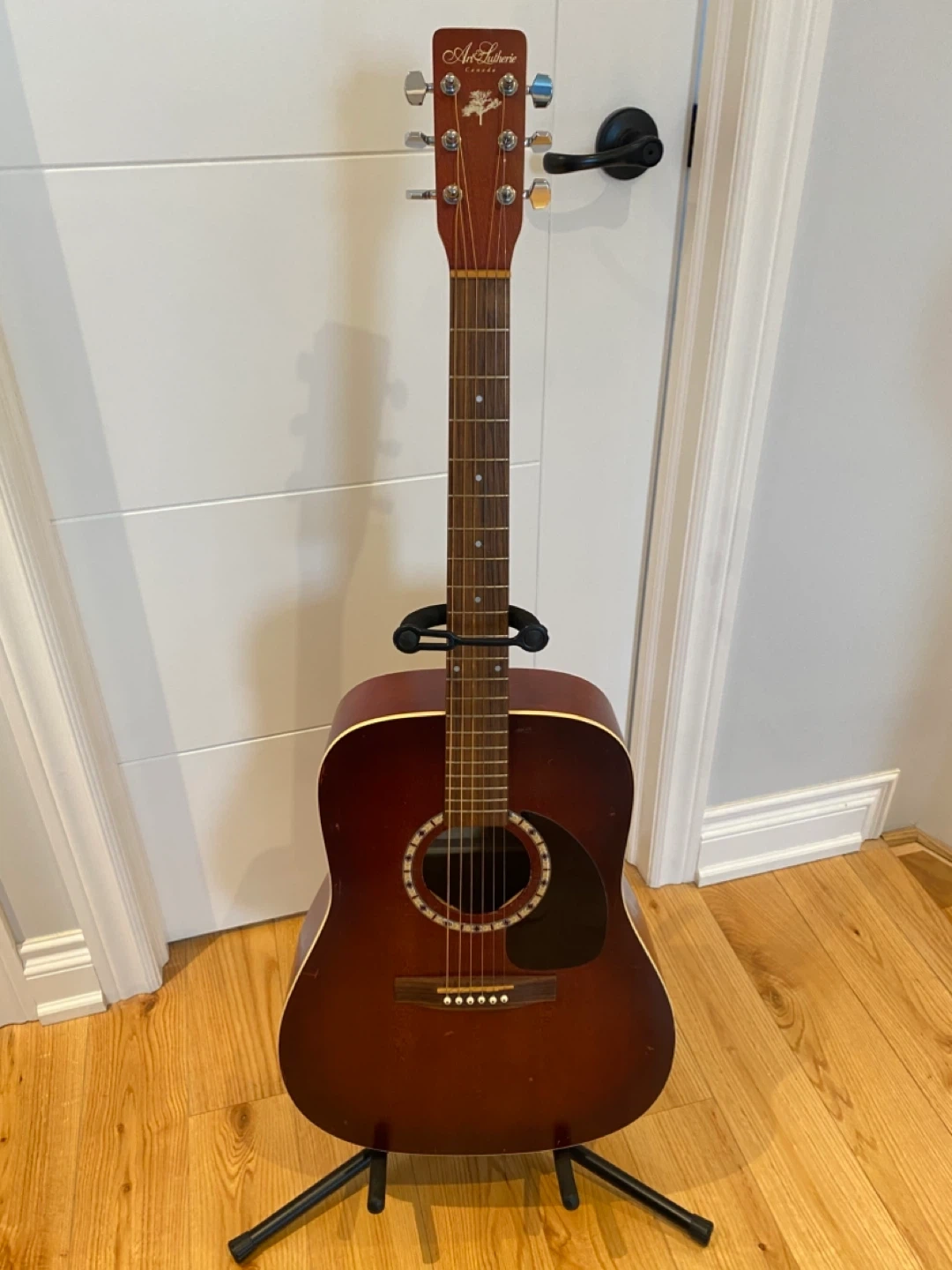 Handcrafted acoustic guitar from Art & Lutherie. Spruce Burgundy model. Easy to play and has a very beautiful sound. Come with stand and Capo. Asking 280$ . Cash and pick up only. Thanks