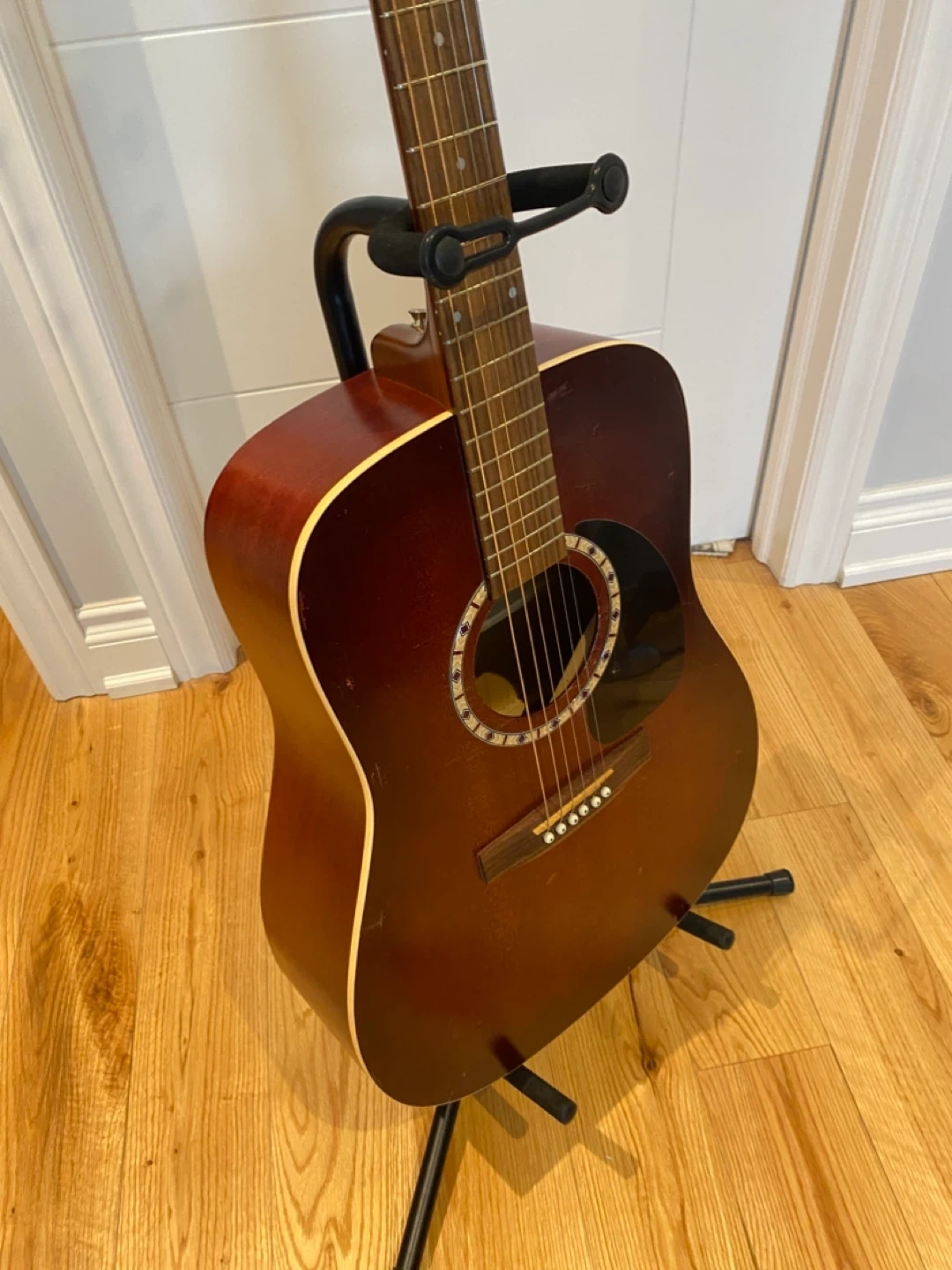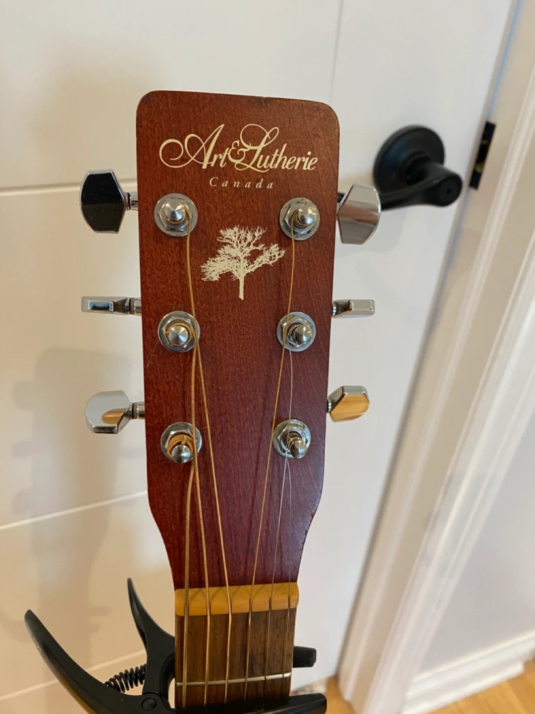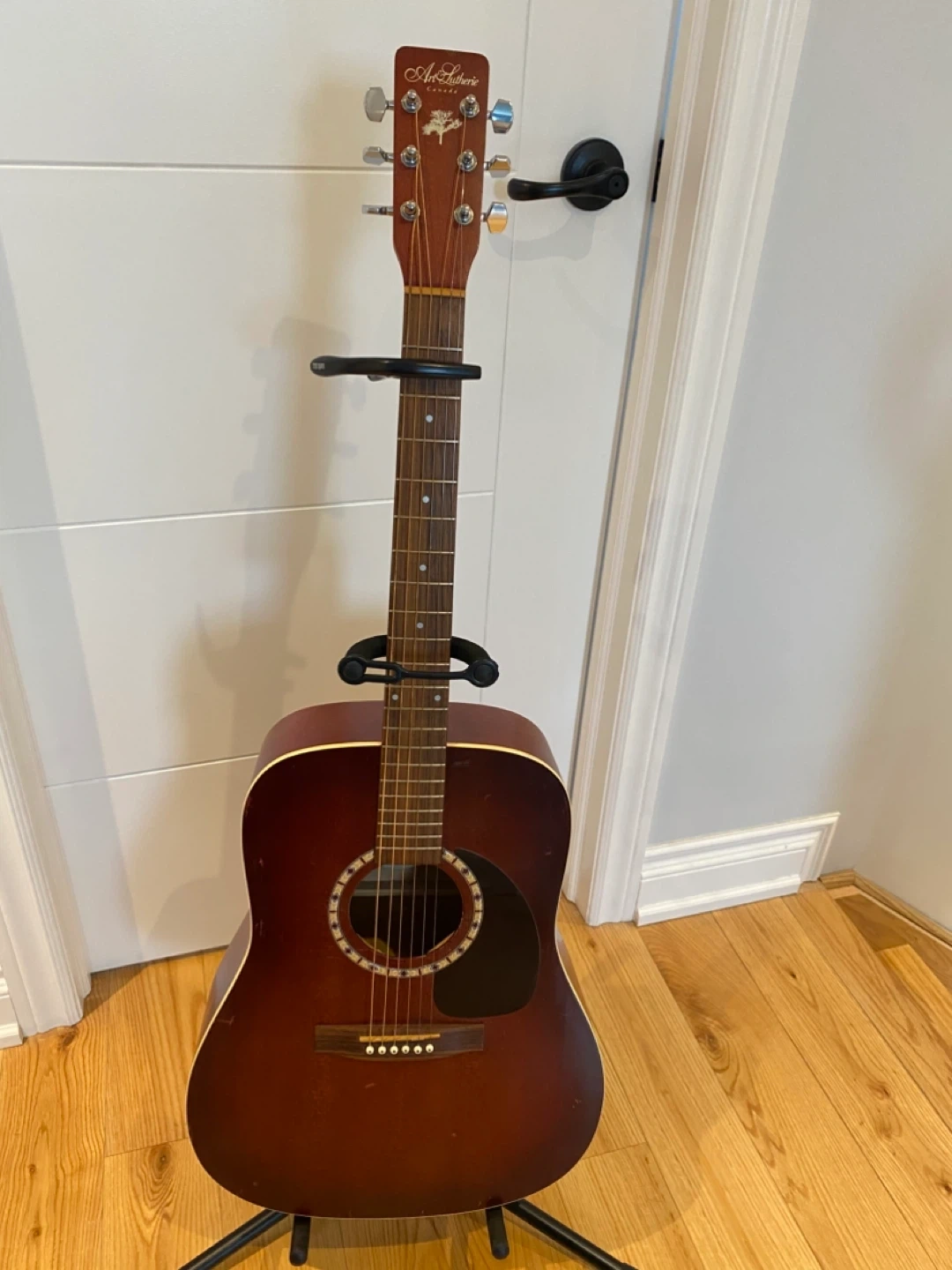 Handcrafted acoustic guitar from Art & Lutherie. Spruce Burgundy model. Easy to play and has a very beautiful sound. Come with stand and Capo. Asking 280$ . Cash and pick up only. Thanks