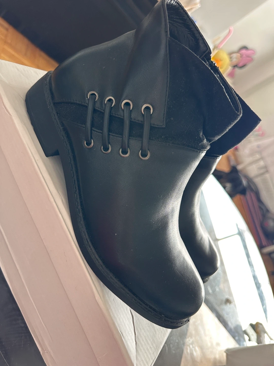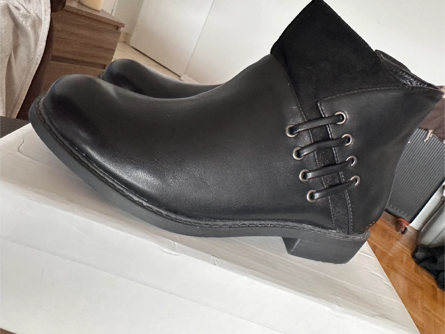 These stylish black ankle boots are made from genuine leather with suede accents. They feature a decorative lacing detail on the side and a comfortable low heel. Perfect for everyday wear! Brand new ! Never worn