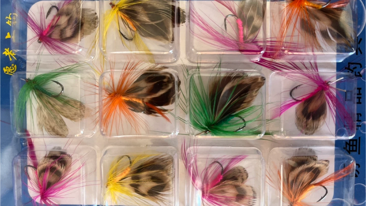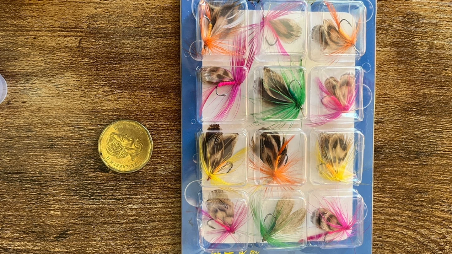 This is a set of 12 fishing lures. The lures are assorted colours and designed with feathers and hooks. They're packaged in a clear plastic blister pack.