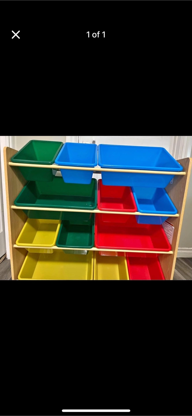 Wooden organizer with coloured plastic bins. Bins in green, blue, red, and yellow. Perfect for storing toys and keeping everything organized, a great way to reduce stress.