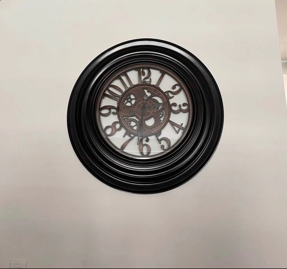 Selling a gently used round wall clock with decorative gears. It has a black frame and an intricate gear design in the centre. It would look great in a living room or office!