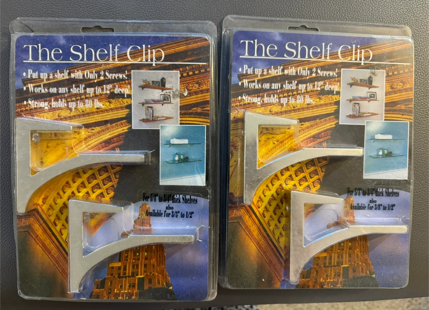 I have two packs of The Shelf Clip, each designed to help you put up a shelf with only 2 screws! They work on any shelf up to 12" deep and can hold up to 80 lbs