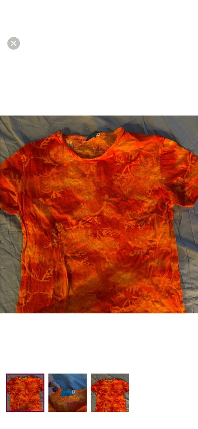 This is a used Kenzo Wave top with an orange cloud pattern, perfect for adding a vibrant touch to your wardrobe. It is in good condition, showing only gentle signs of wear. Specifications: - Brand: Kenzo Wave - Size: Small - Colour: Orange Cloud - Fit: Regular. Remember, if you're seeing this ad, it means this stylish top is still waiting to find its new home! Grab it before someone else does! I've priced it fairly to sell.