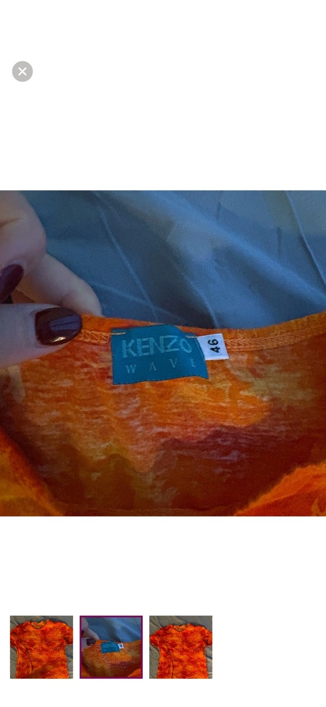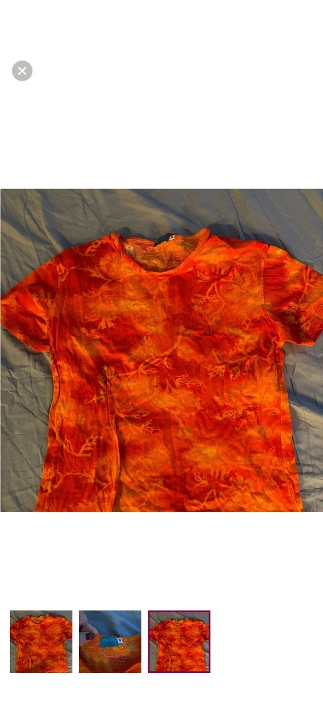 This is a used Kenzo Wave top with an orange cloud pattern, perfect for adding a vibrant touch to your wardrobe. It is in good condition, showing only gentle signs of wear. Specifications: - Brand: Kenzo Wave - Size: Small - Colour: Orange Cloud - Fit: Regular. Remember, if you're seeing this ad, it means this stylish top is still waiting to find its new home! Grab it before someone else does! I've priced it fairly to sell.