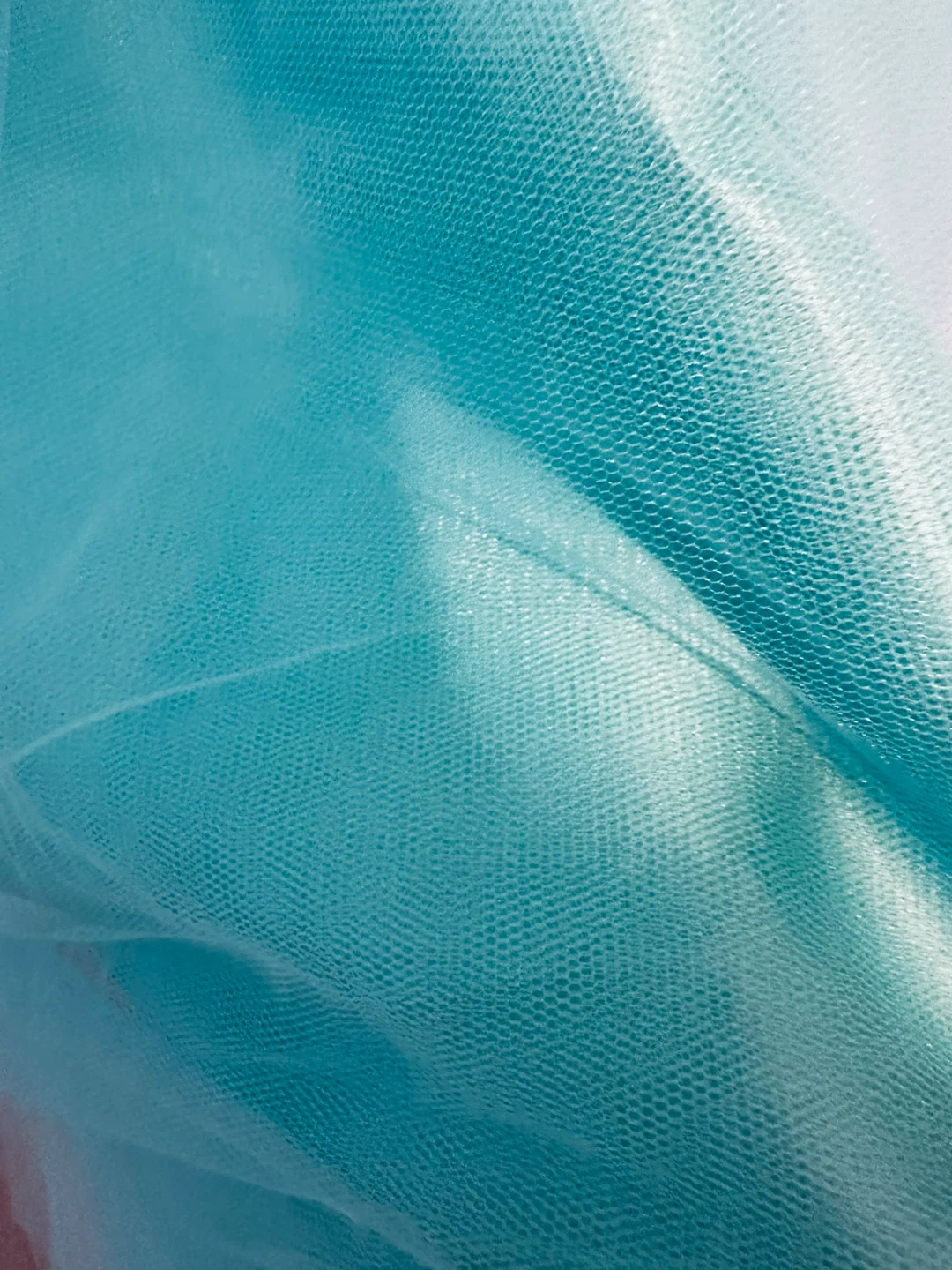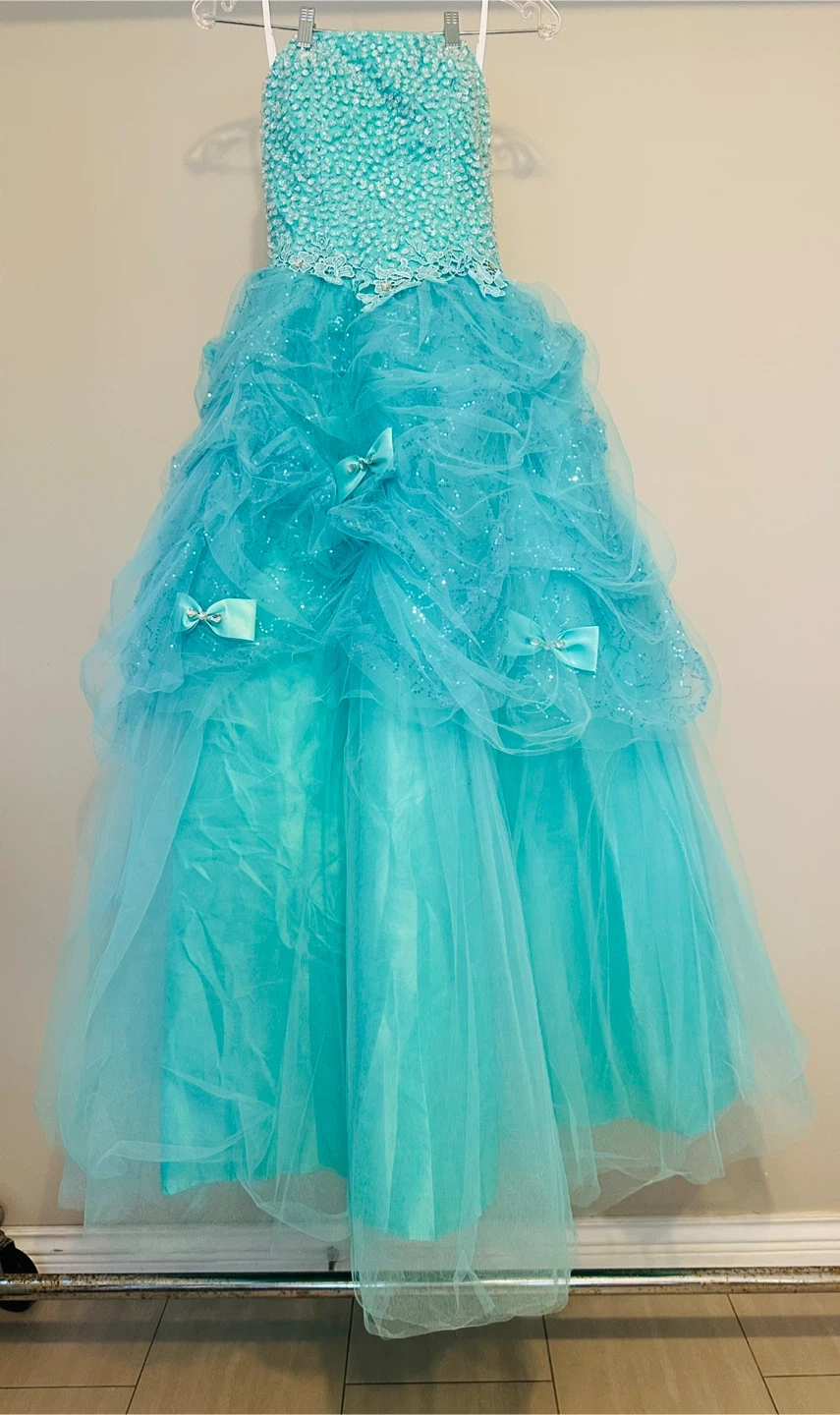 A stunning turquoise formal gown with intricate beadwork on the bodice and scattered sequins throughout the skirt. This dress features a full, layered tulle skirt with ruffle accents and a corset-style lace-up back. It's perfect for special occasions like proms or weddings!