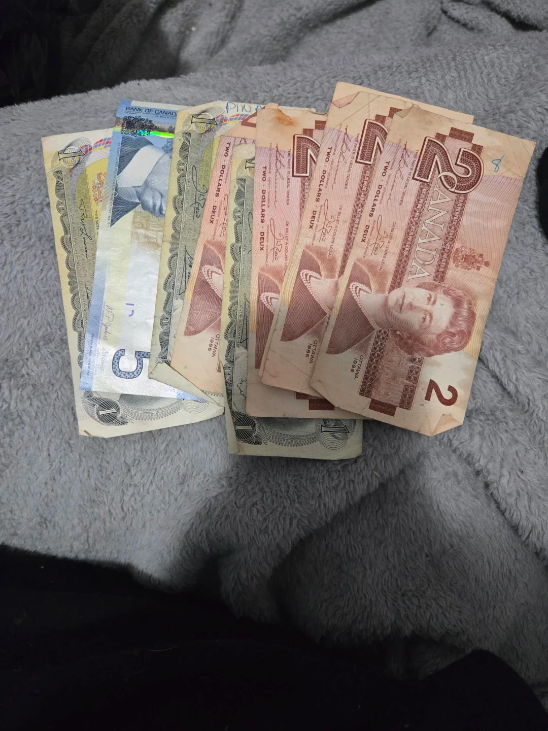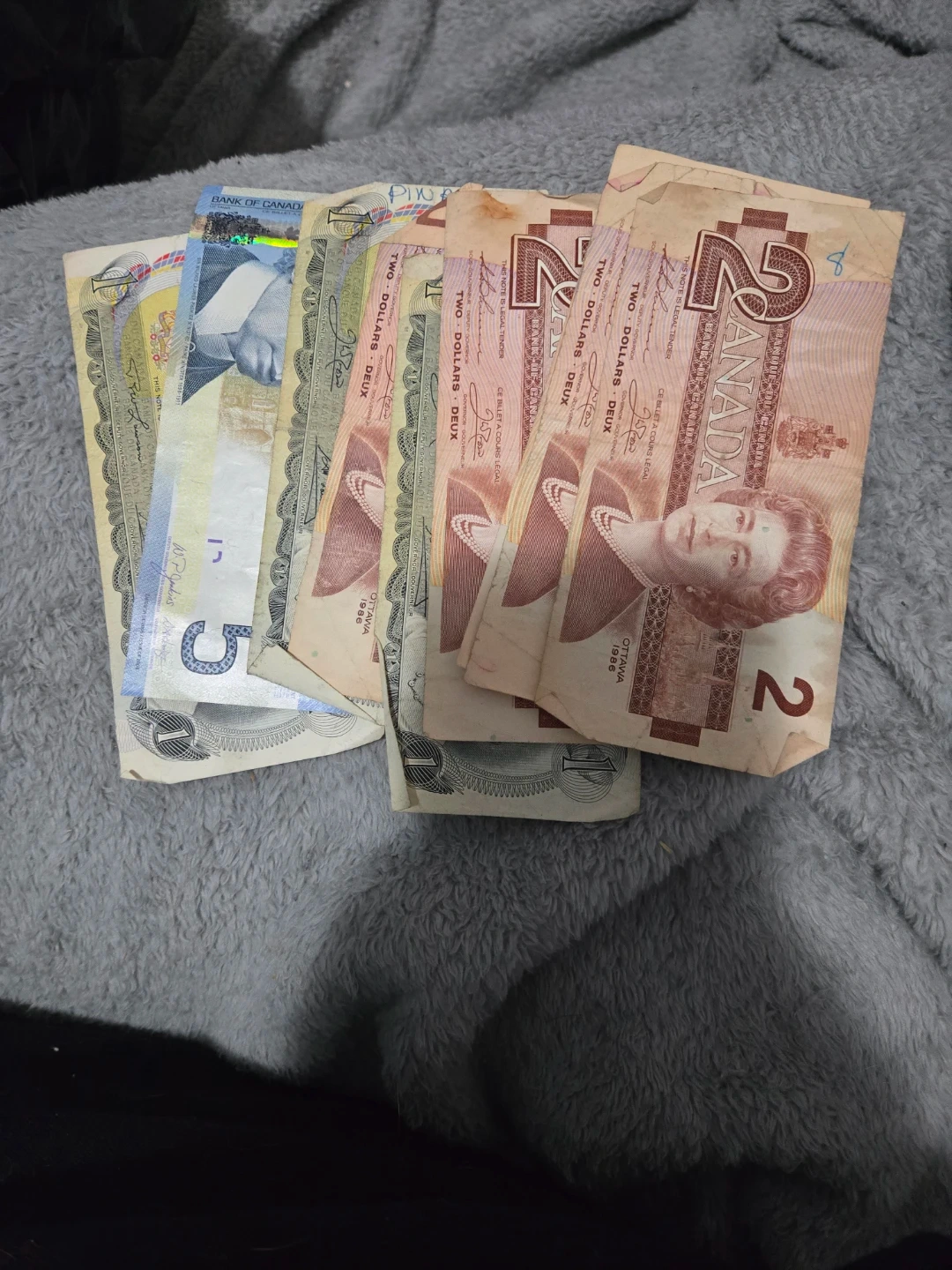 A collection of Canadian paper currency, including $1, $2 and $5 bills. These bills are from circulation and show some signs of wear. They are made of polymer and paper composite. Great for collectors or anyone needing some Canadian cash!