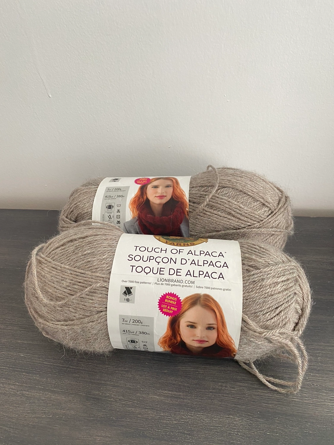 Two skeins of Lion Brand Touch of Alpaca yarn in the colour Taupe. Each skein is 415 yards / 380 metres. Great for knitting, crochet, or other crafts.