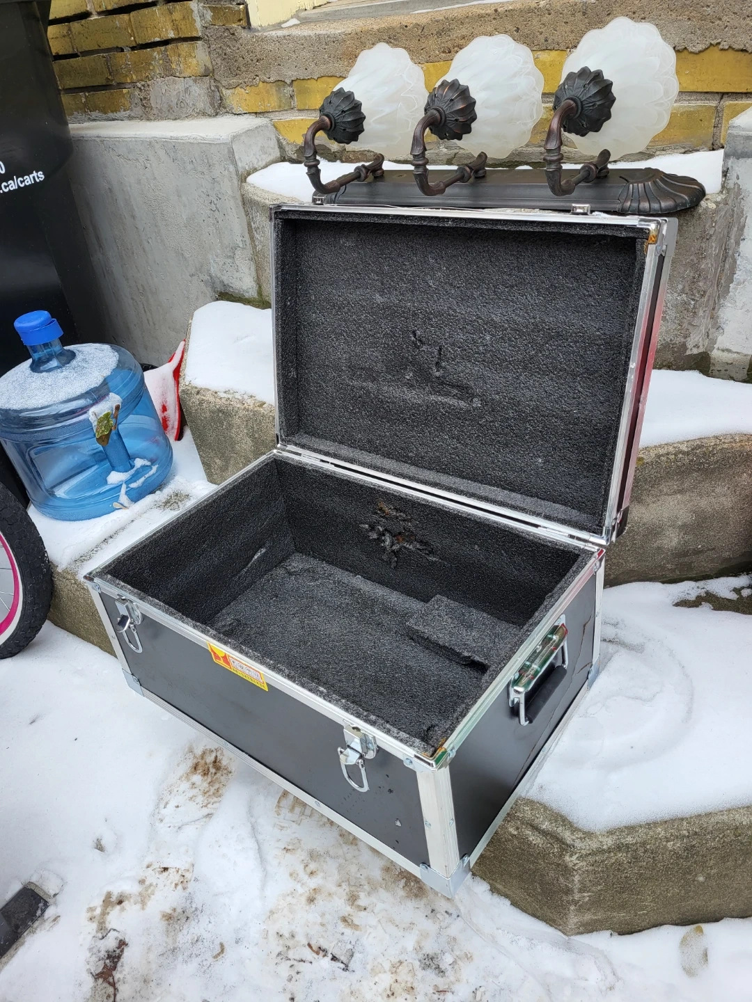 Heavy-duty black ATA flight case with silver metal trim and latches. It's lined with foam padding for protection. This case would be useful for transporting sensitive equipment.