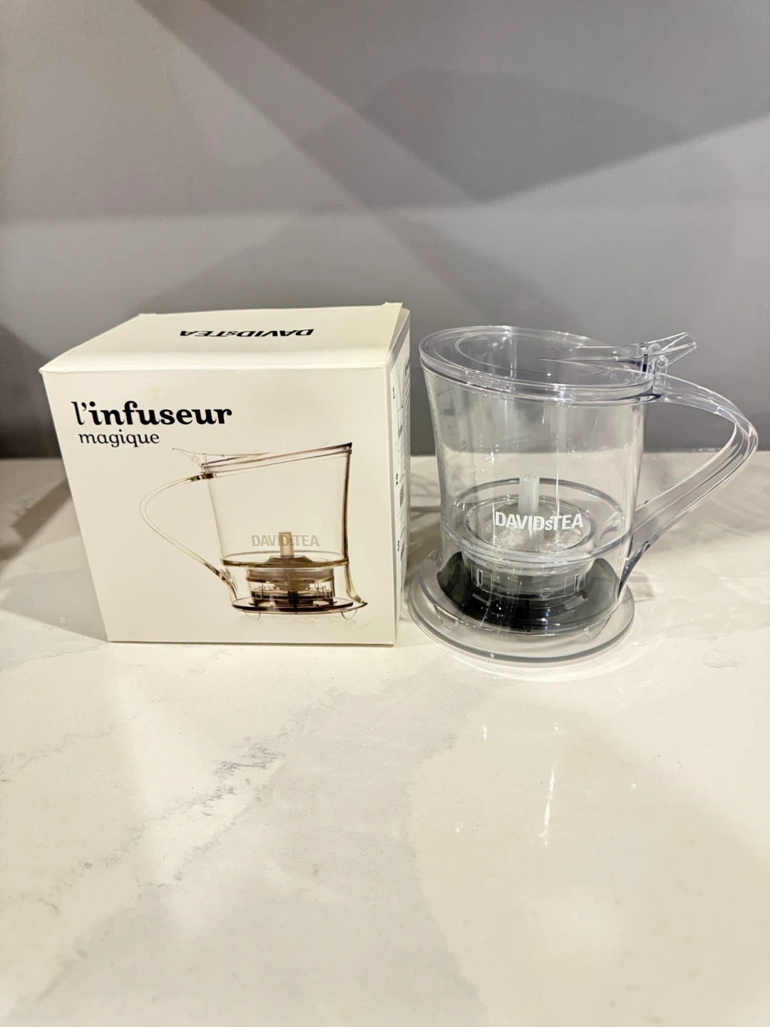 This is a BNIB clear plastic tea infuser from DAVIDsTEA, labelled 'L'infuseur magique'. It's designed for easy steeping of loose leaf tea. The infuser comes with its original box.