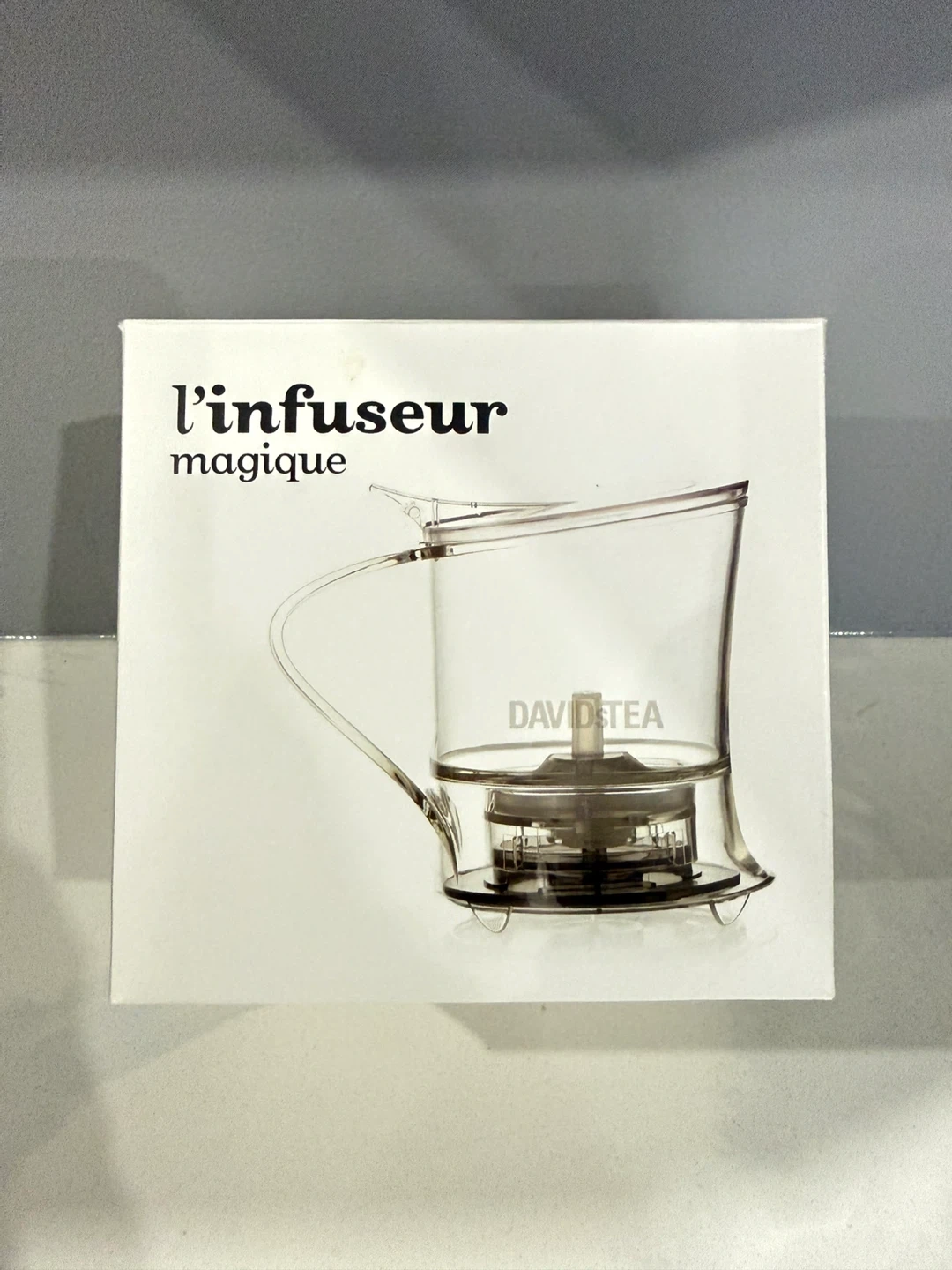 This is a BNIB clear plastic tea infuser from DAVIDsTEA, labelled 'L'infuseur magique'. It's designed for easy steeping of loose leaf tea. The infuser comes with its original box.