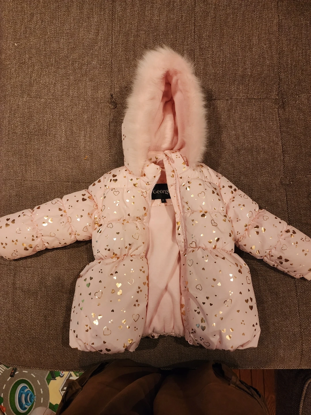 This George puffer jacket is a cute pink colour with gold hearts all over it. Size 2 lightly used