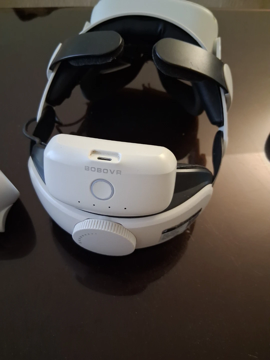 This is a Meta Quest 2 VR headset bundled with a BOBOVR battery pack. The headset is white and comes with two controllers. The BOBOVR attachment is also white and provides extended playtime. It's compatible with the Meta Quest 2. (The face cover is slightly damaged as you can tell by the third image)