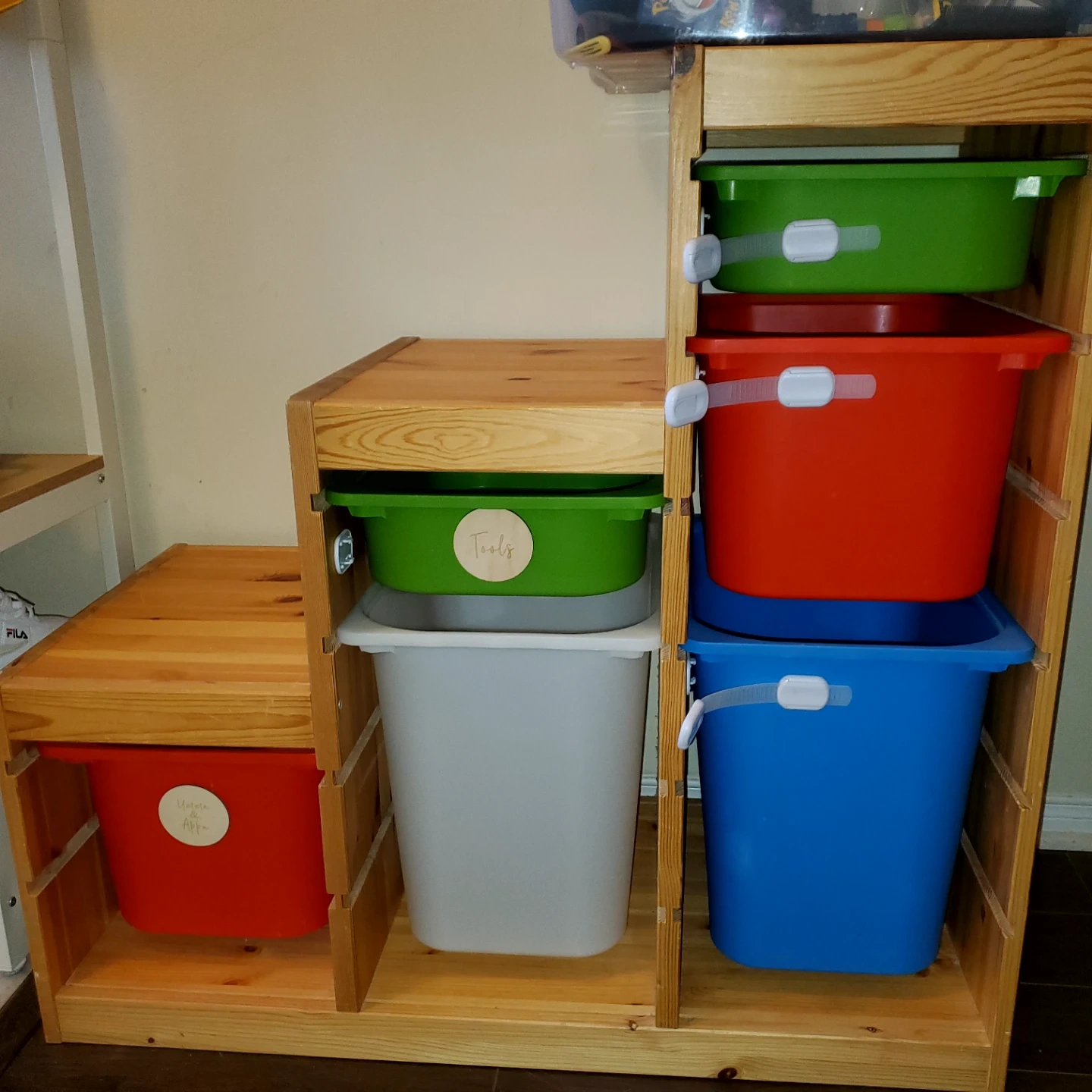 This is a set of IKEA TROFAST storage bins. Includes red, green, blue, and white bins with lids. Some bins have labels for 'Tools' and 'Mom & App'. Great for organizing toys or craft supplies!