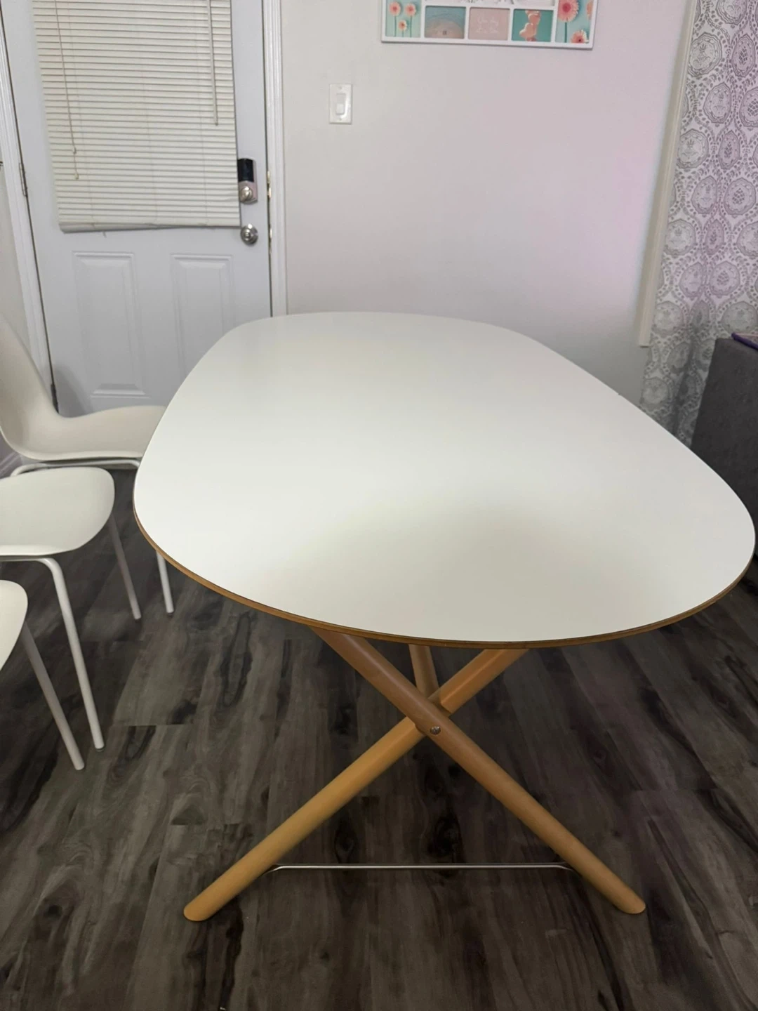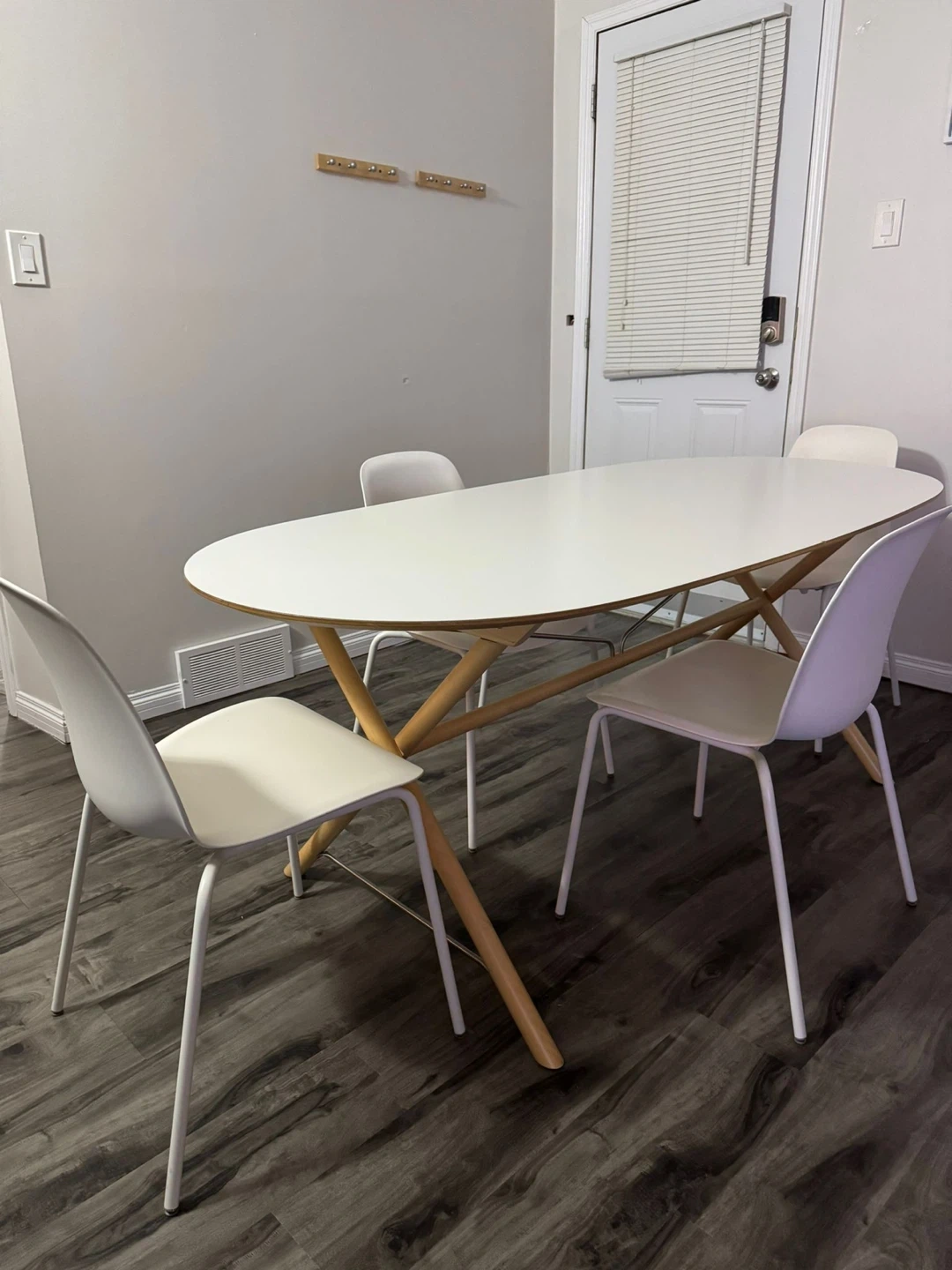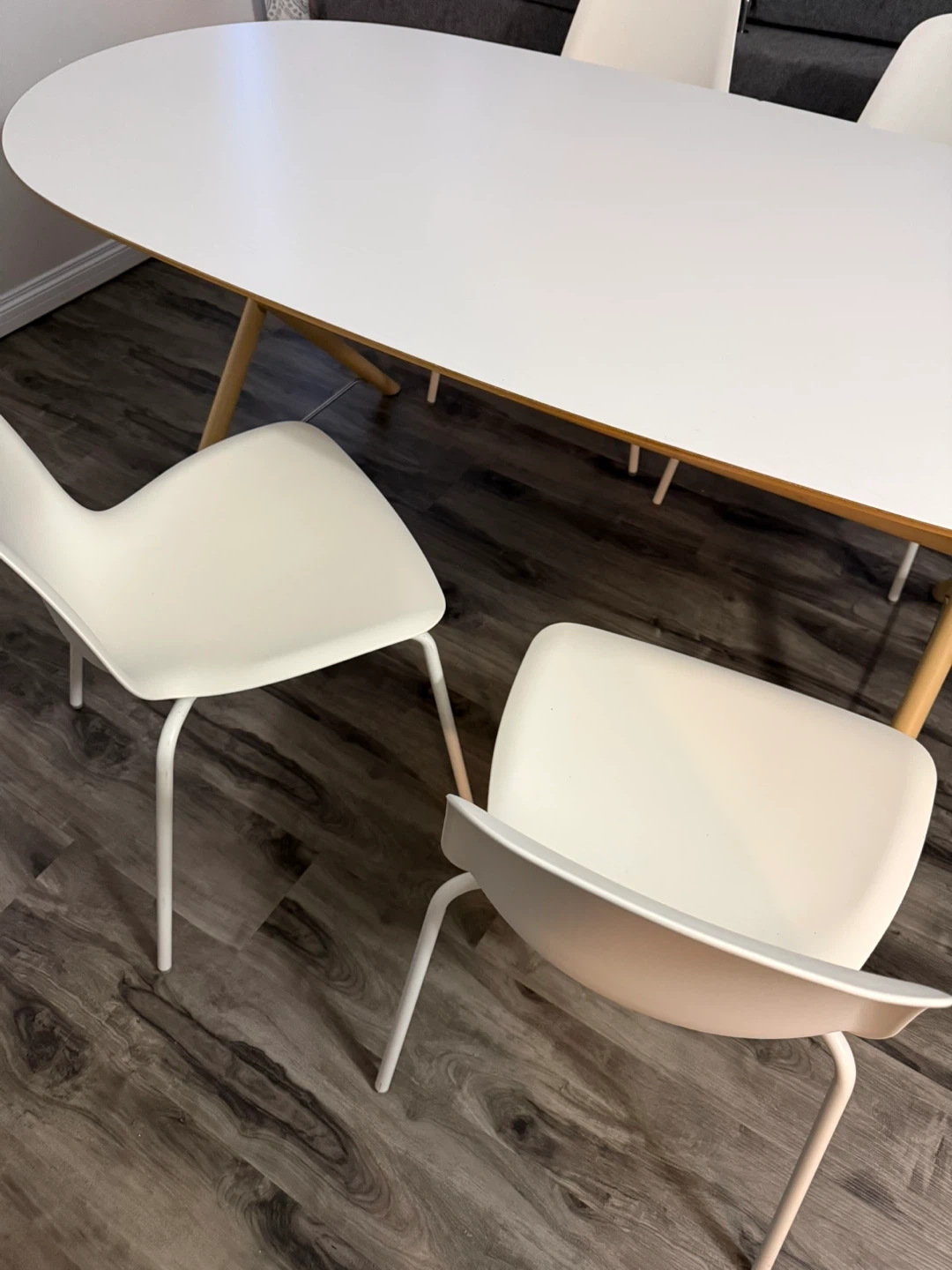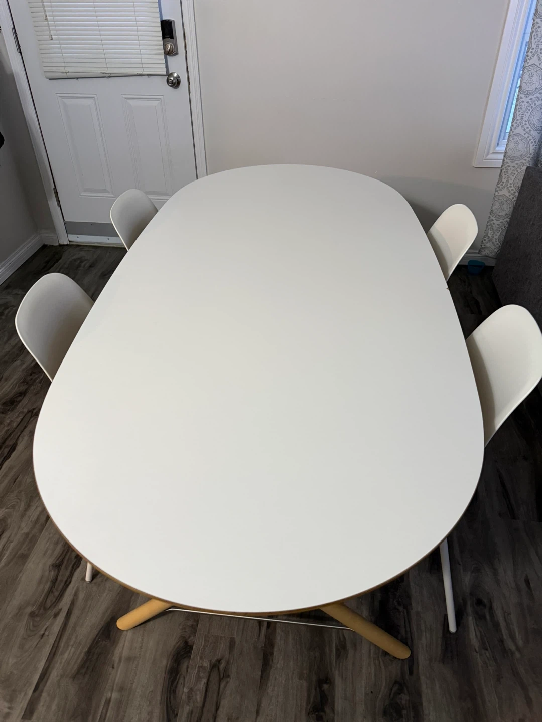 This set includes a white oval dining table with a wood base and four matching white chairs. The chairs have metal legs. It's a stylish and functional addition to any dining space.