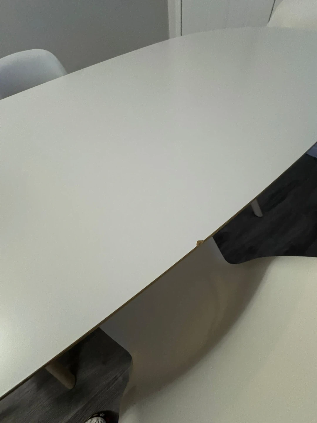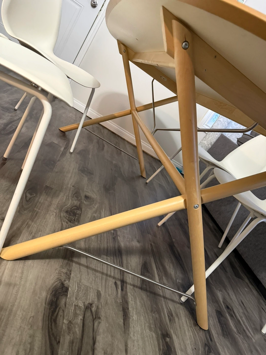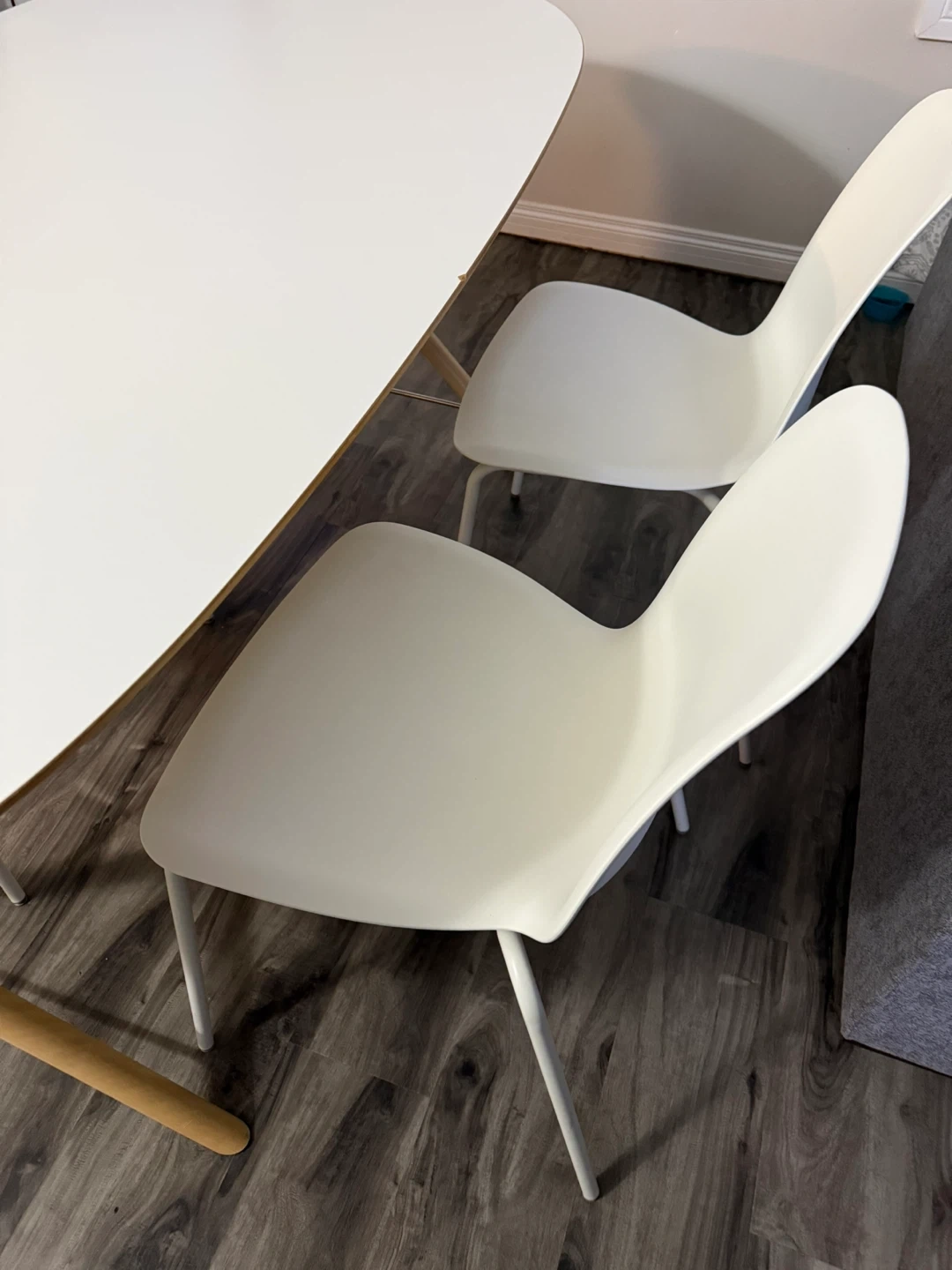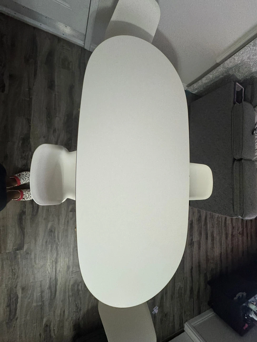 This set includes a white oval dining table with a wood base and four matching white chairs. The chairs have metal legs. It's a stylish and functional addition to any dining space.