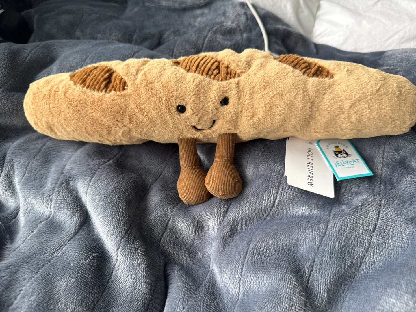 This is a Jellycat Amuseable Baguette plush toy. It's made of soft, fuzzy material with stitched details to resemble a real baguette. This plush is perfect for playtime or as a cute room decoration!