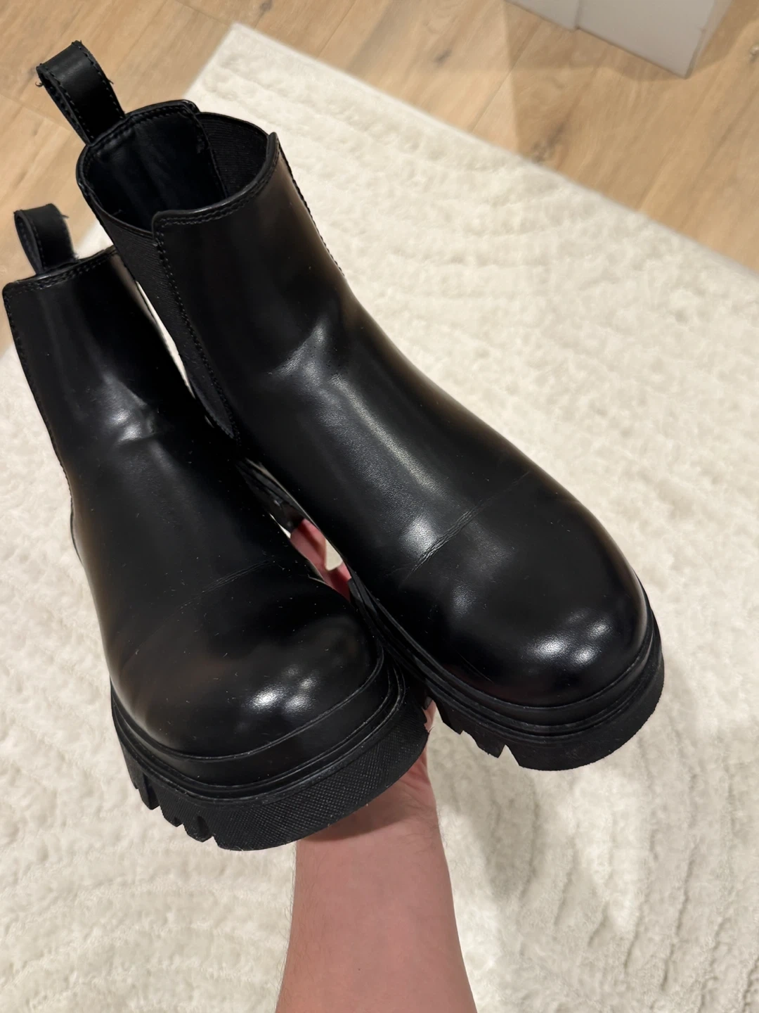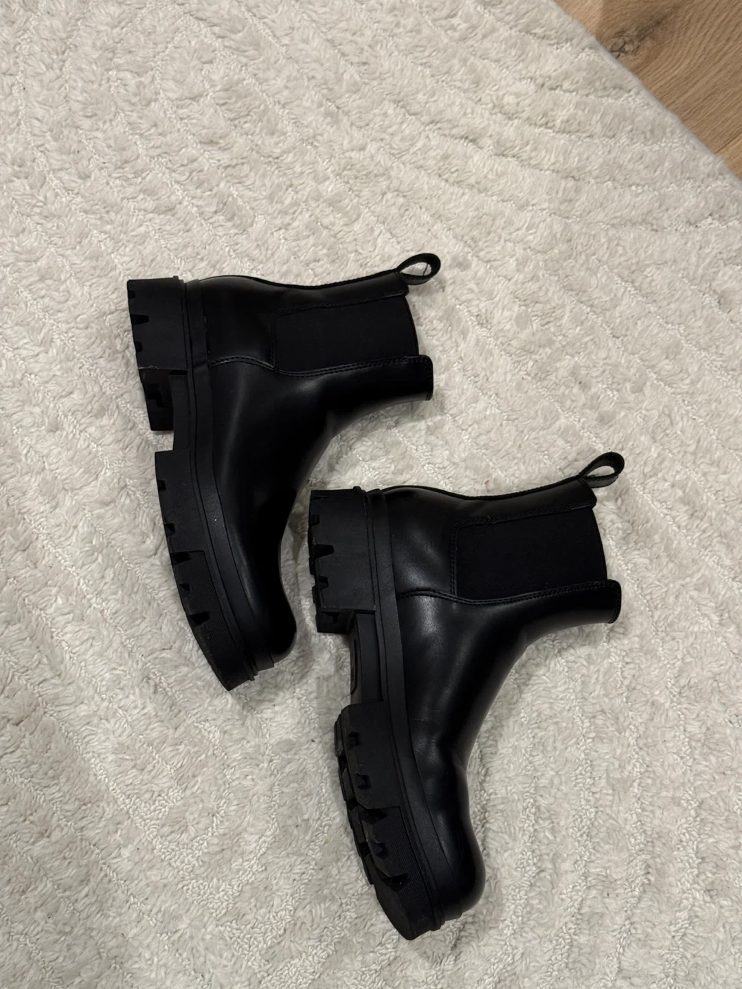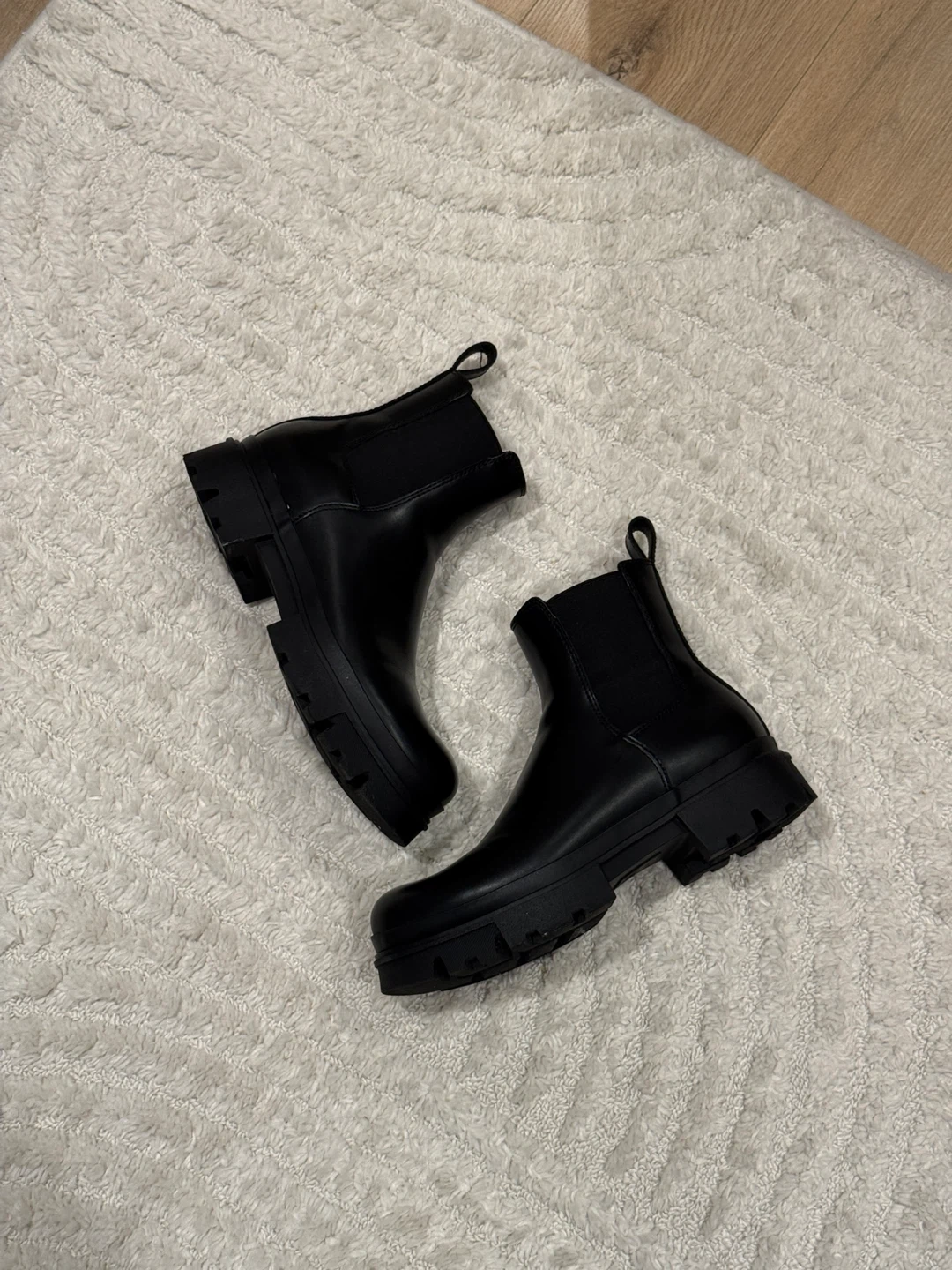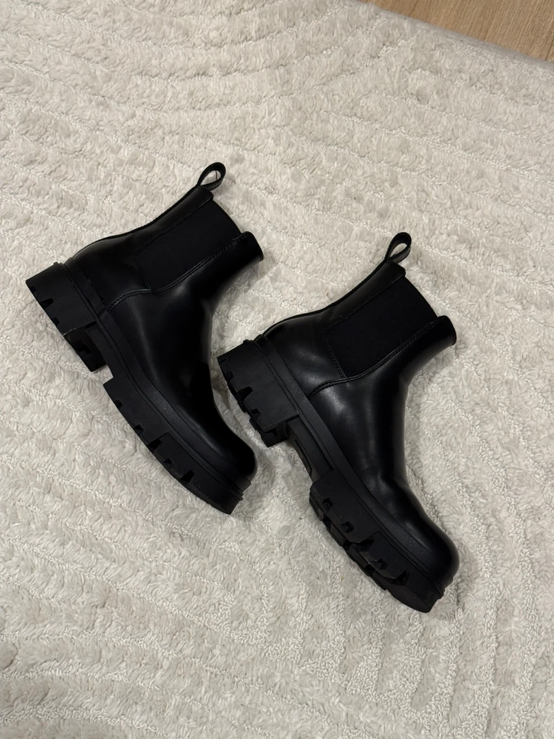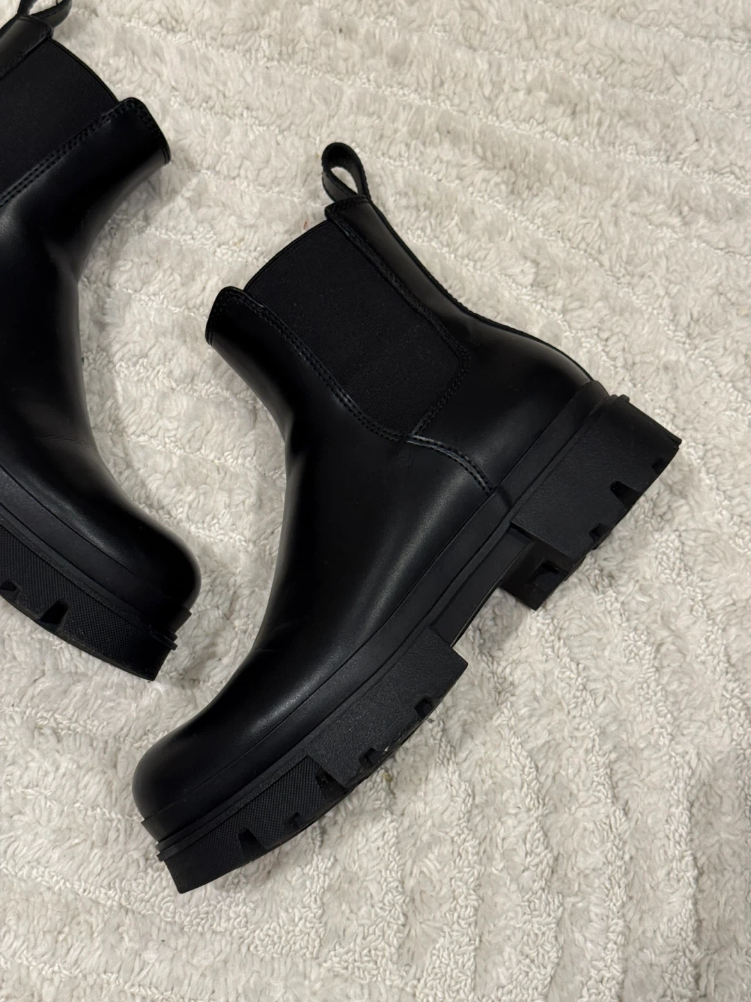 These black chunky Chelsea boots feature elastic side panels for easy on and off. They have a durable lug sole for extra grip. These boots are perfect for everyday wear!