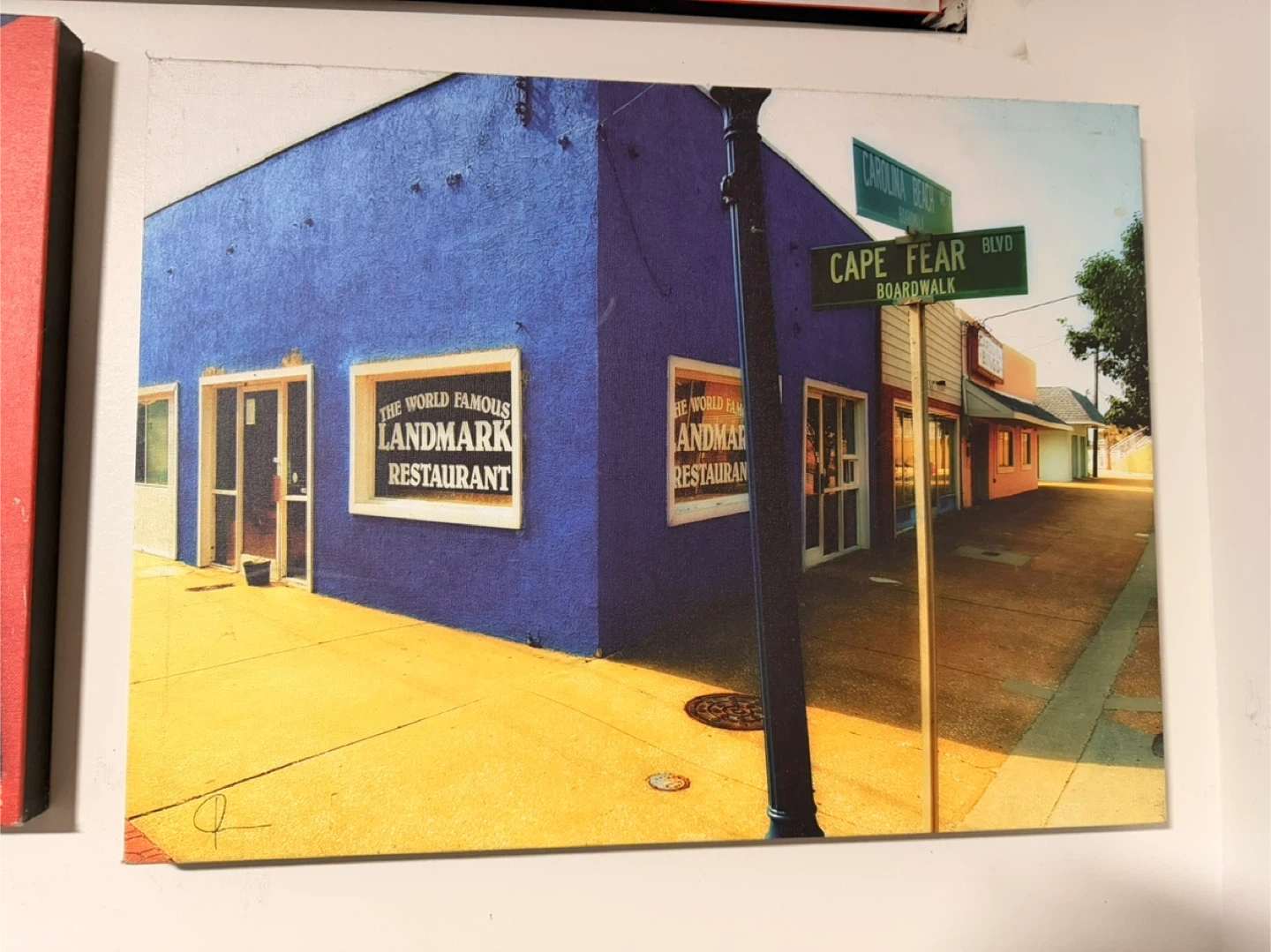 Canvas art featuring the Black Horn bar & kitchen, a vibrant building with bright red and yellow walls. Another scene shows a blue building with "The World Famous Landmark Restaurant" signage. These pieces capture a lively streetscape with colourful architecture and signage. Perfect for adding a pop of colour to your decor!