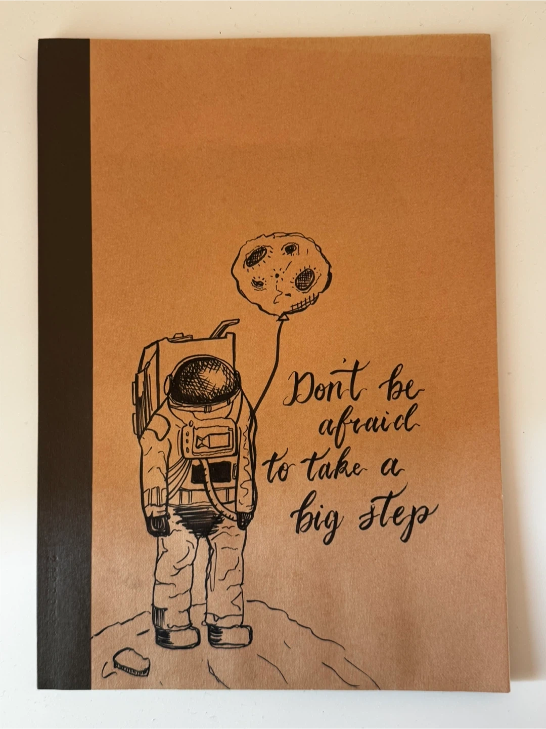This notebook boasts a cool astronaut graphic hand-drawn by me. It features a motivational quote: “Don’t be afraid to take a big step”. The kraft-style paper cover is bound in black. It’s perfect for jotting down ideas or tackling schoolwork!