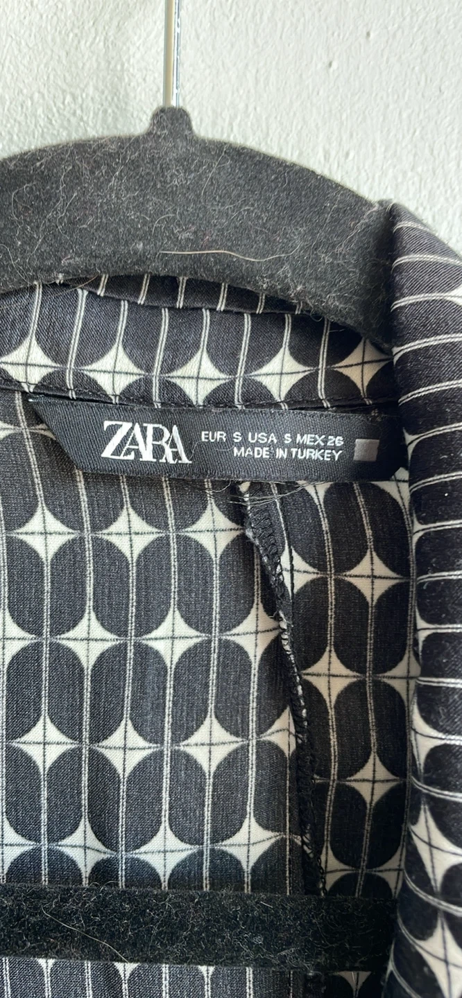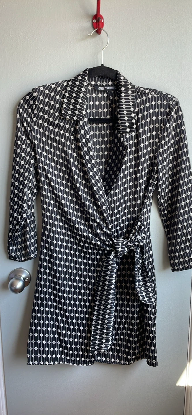 This ZARA wrap dress features a striking geometric pattern in black and white. It's a size S, made in Turkey. The dress has a tie waist for a custom fit.