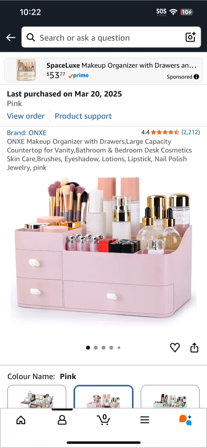 ONXE pink makeup organizer with drawers. Large capacity countertop storage for vanity, bathroom, or bedroom. It's great for cosmetics, skincare, brushes, eyeshadow, lotions, lipstick, nail polish, and jewelry.