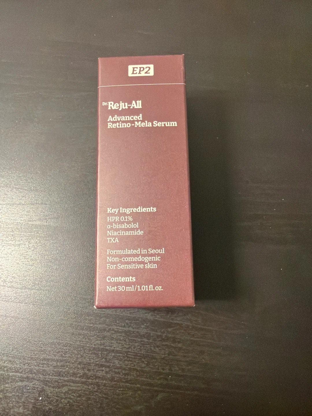 This is Dr. Reju-All Advanced Retino-Mela Serum. It's formulated in Seoul and is non-comedogenic, making it suitable for sensitive skin. Contains HPR 0.1%, α-bisabolol, niacinamide, and TXA. Net 30 ml / 1.01 fl.oz.