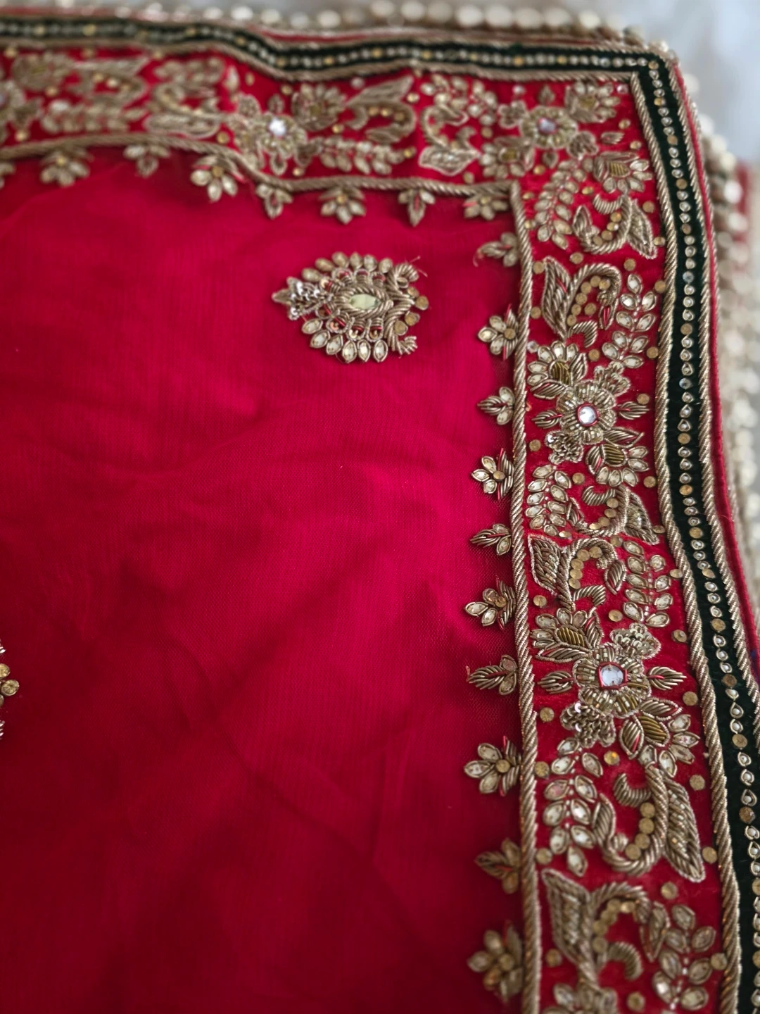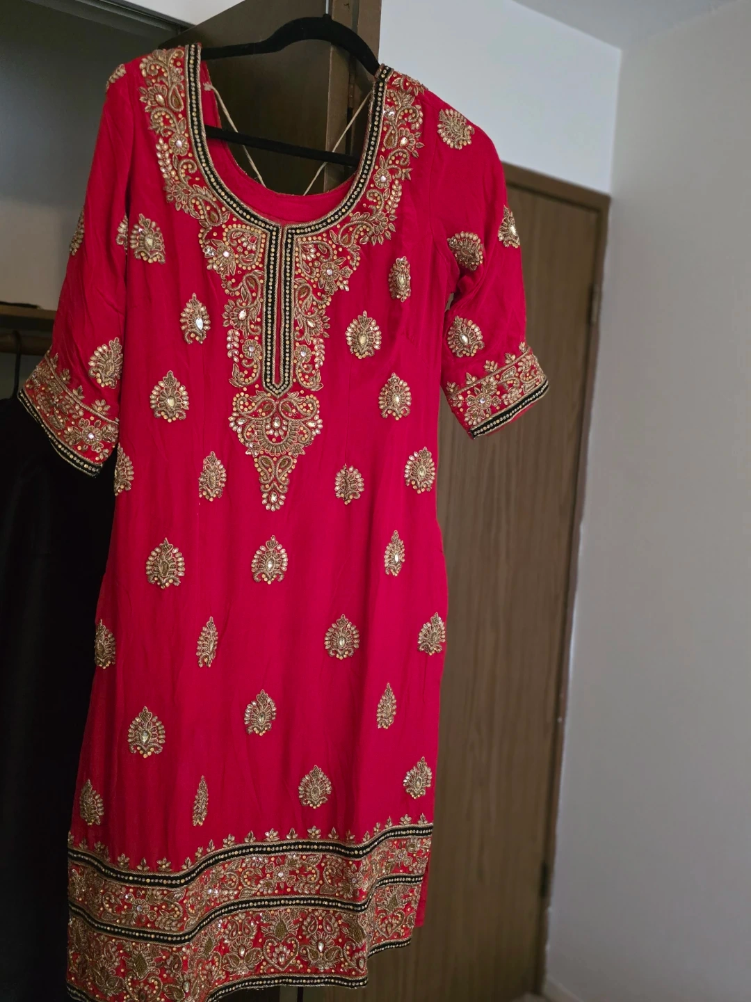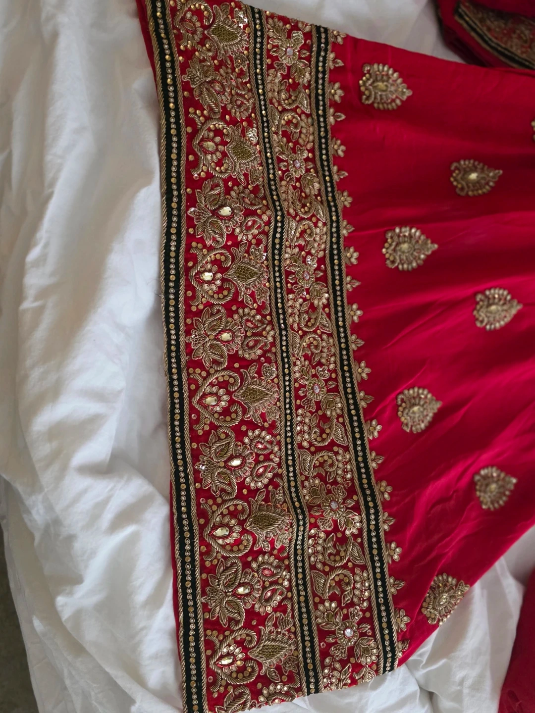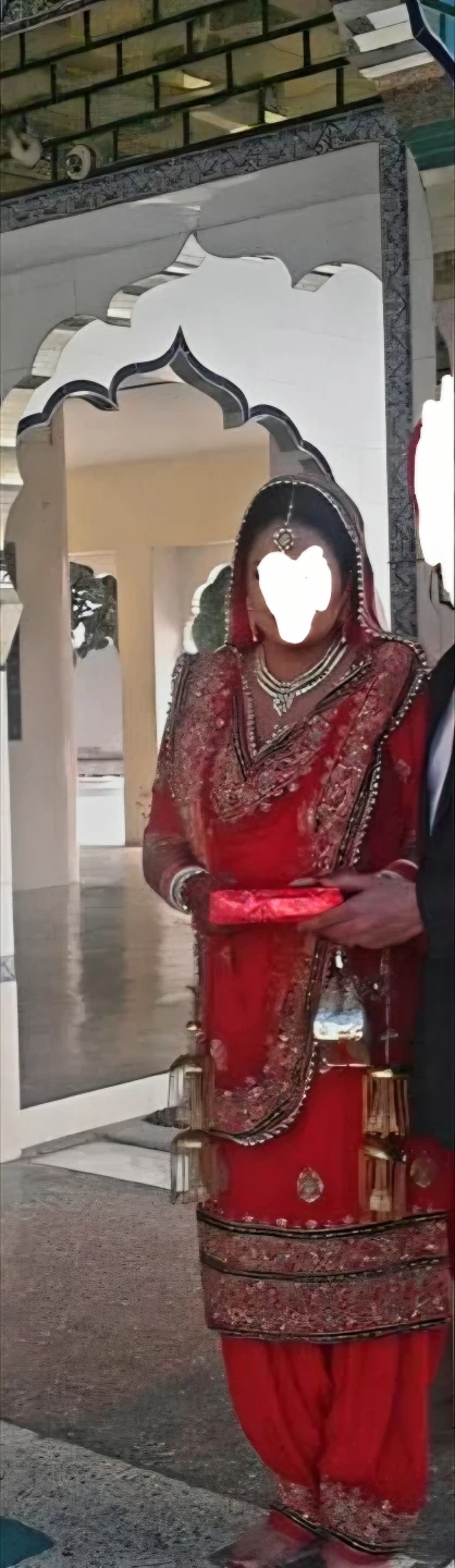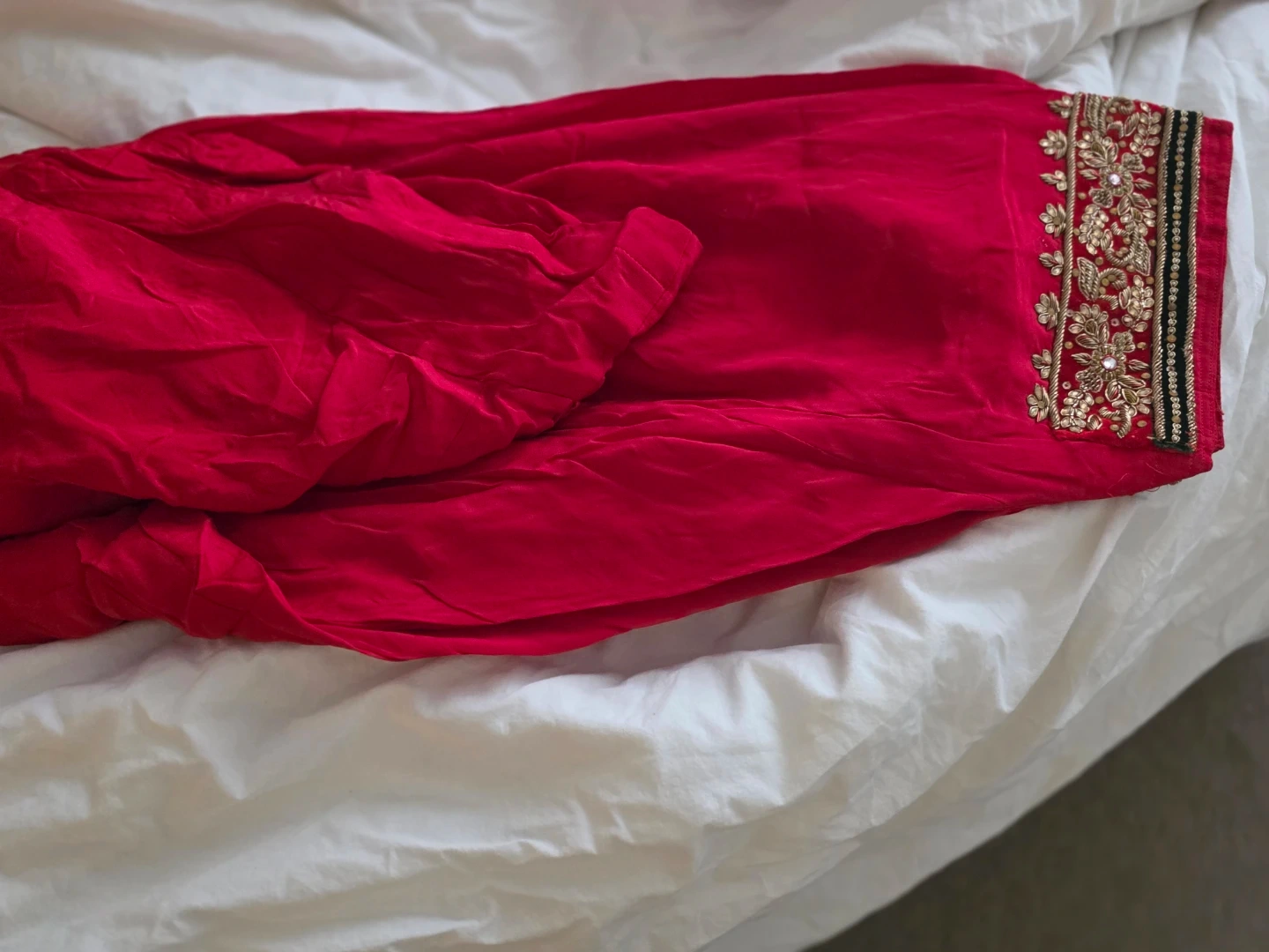 Tomato red, punjabi wedding suit with salwaar and dupatta.