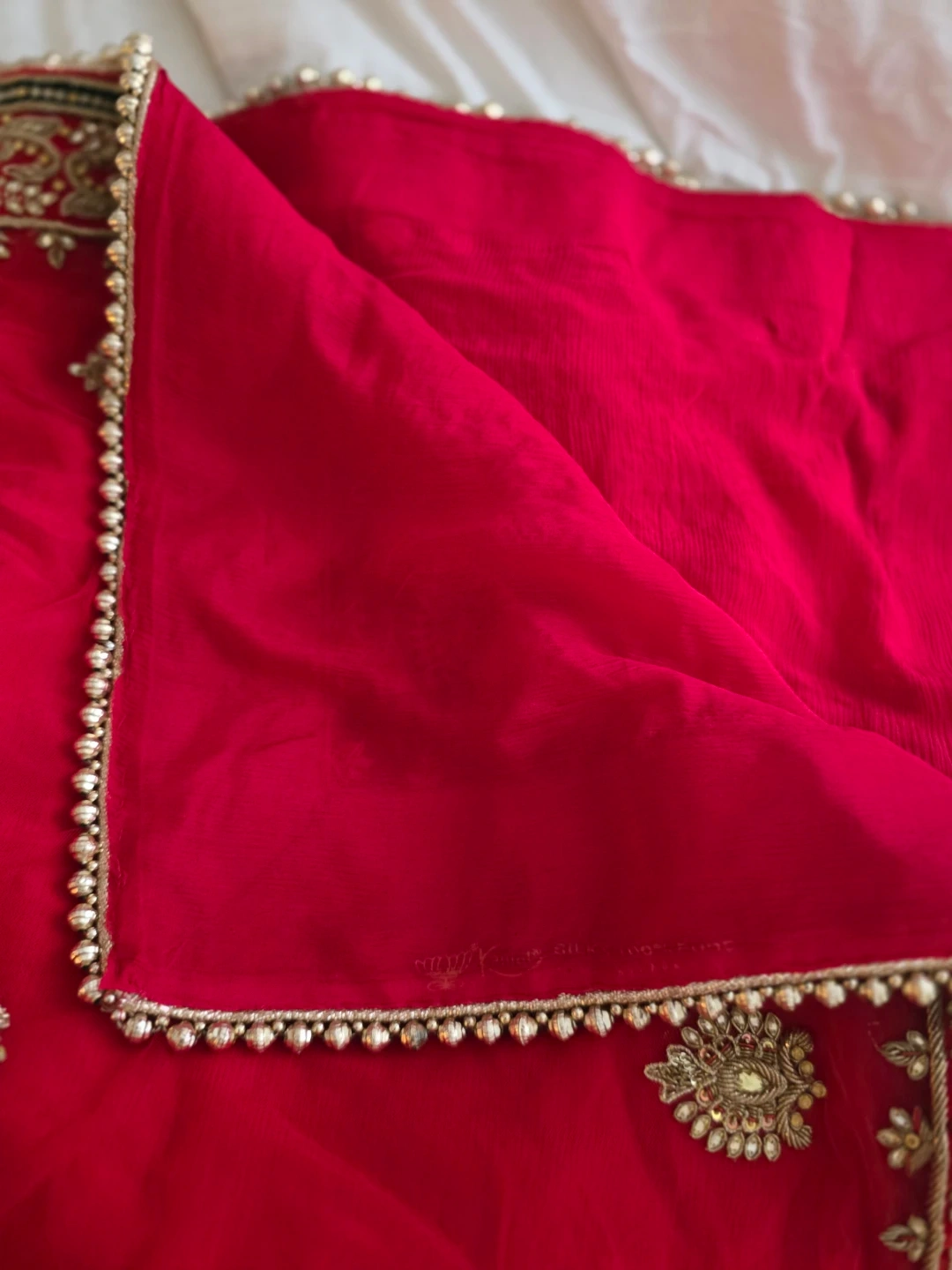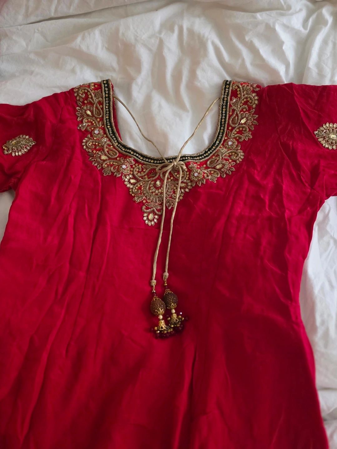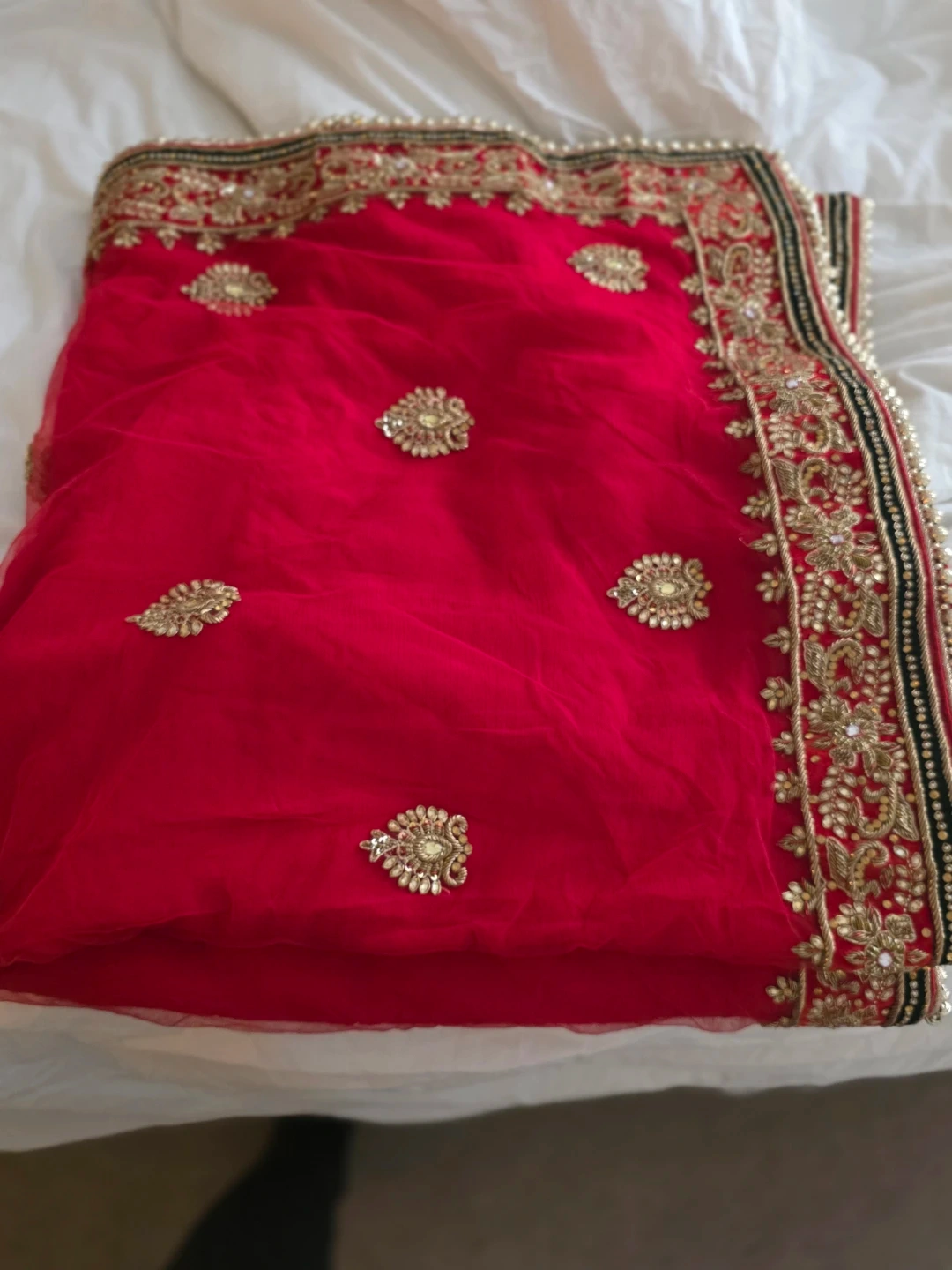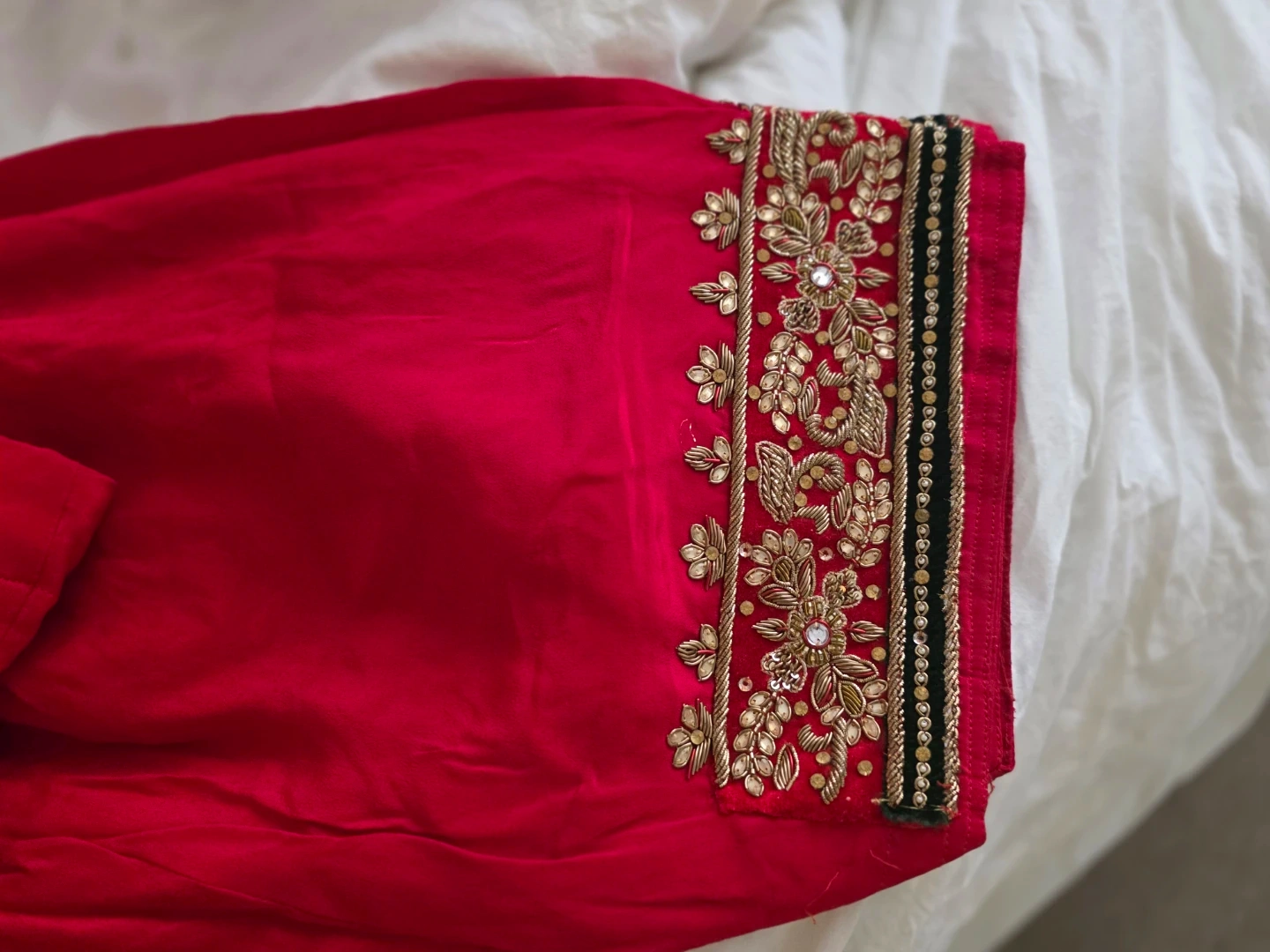 Tomato red, punjabi wedding suit with salwaar and dupatta.