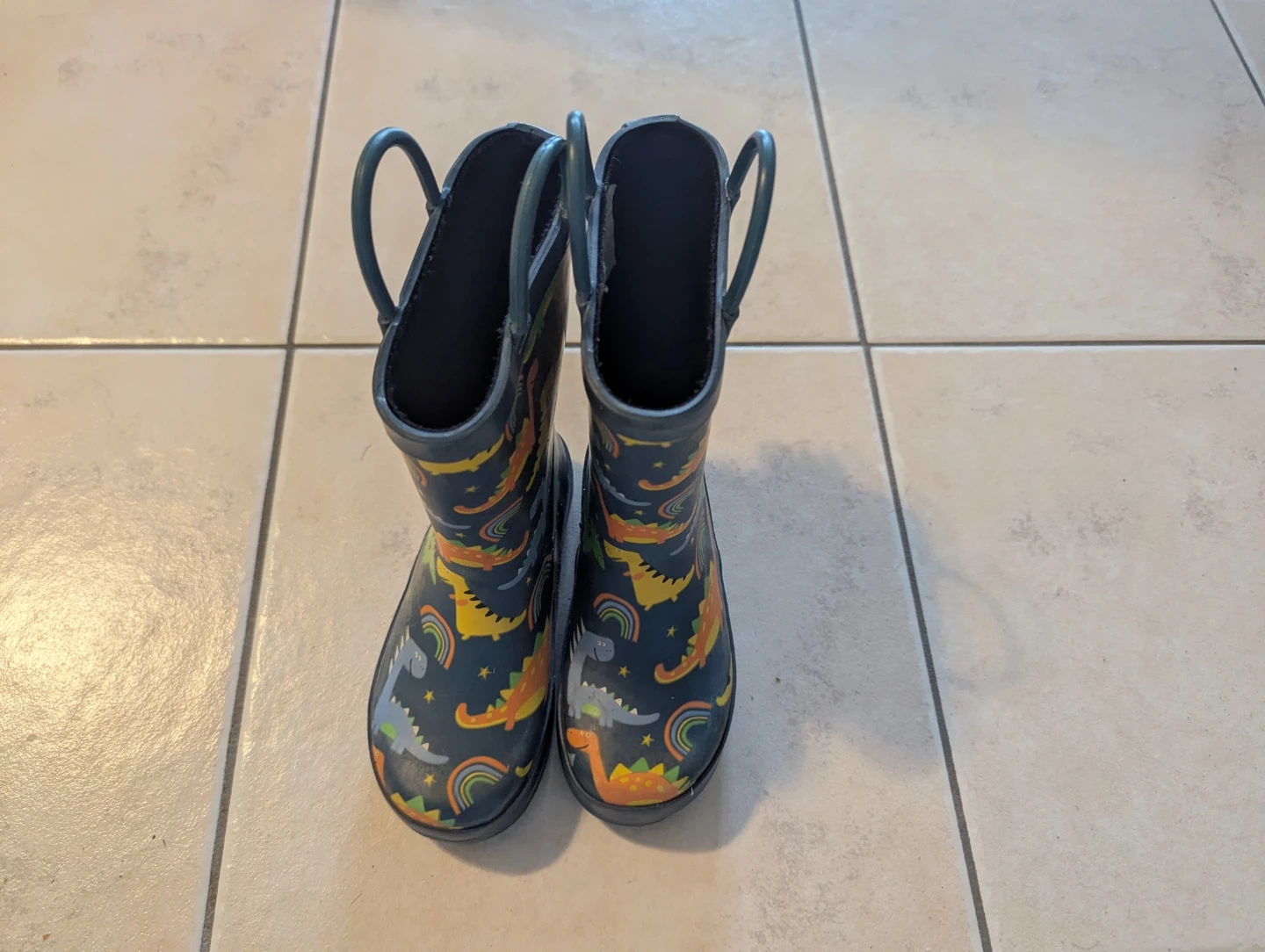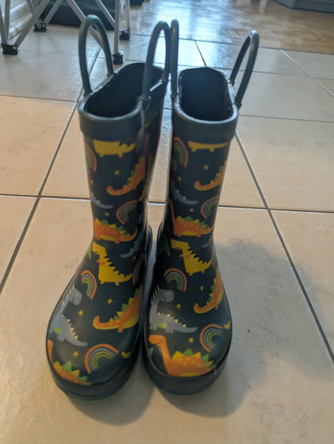 Cute dinosaur and rainbow patterned rain boots for kids. They're perfect for splashy adventures on rainy days! Easy-pull handles make them simple to get on and off.