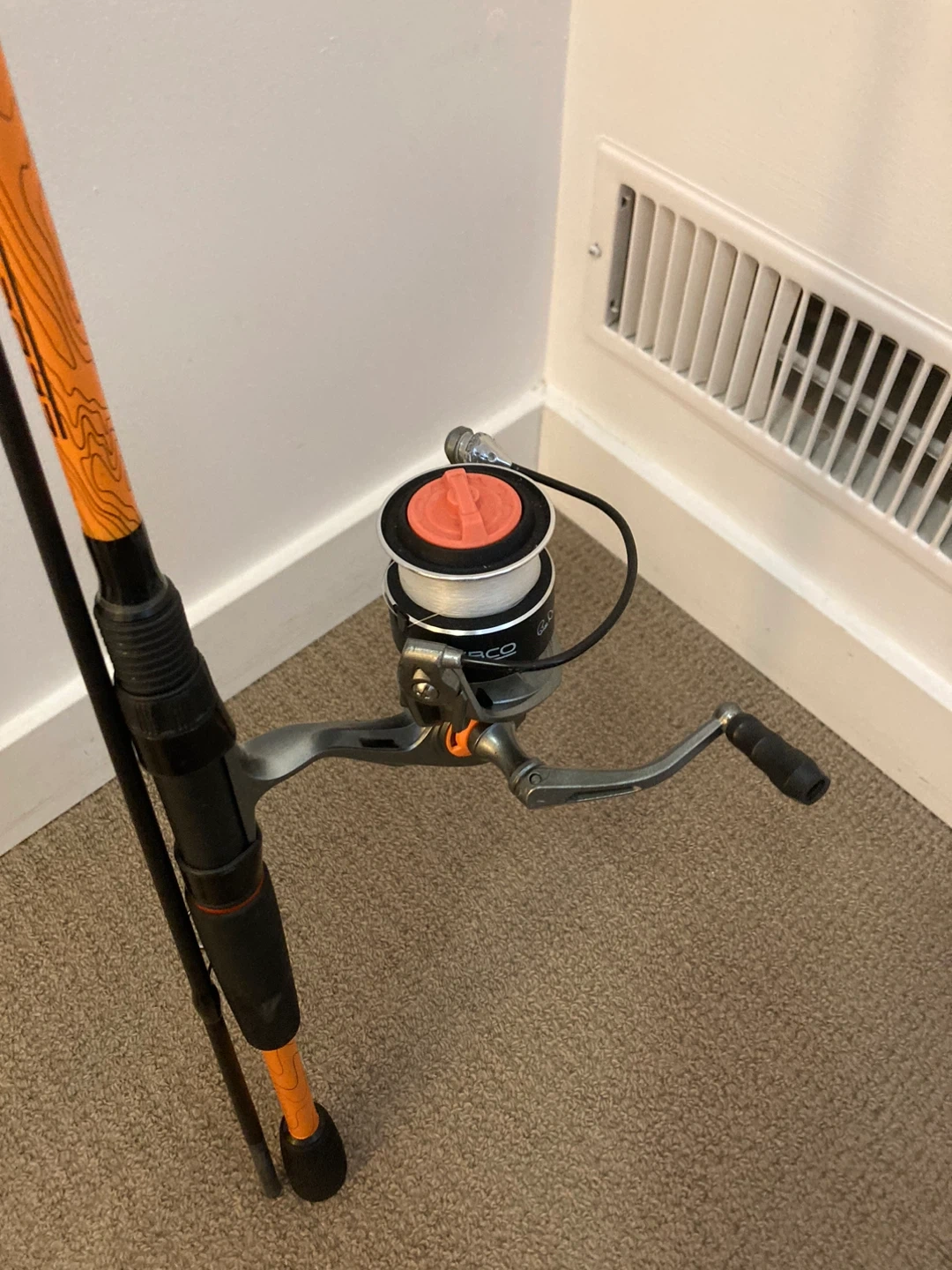 This is a Zebco fishing rod and reel combo. The rod is orange and black with a reel attached. Had it for a year good for fishing cod and Salmon