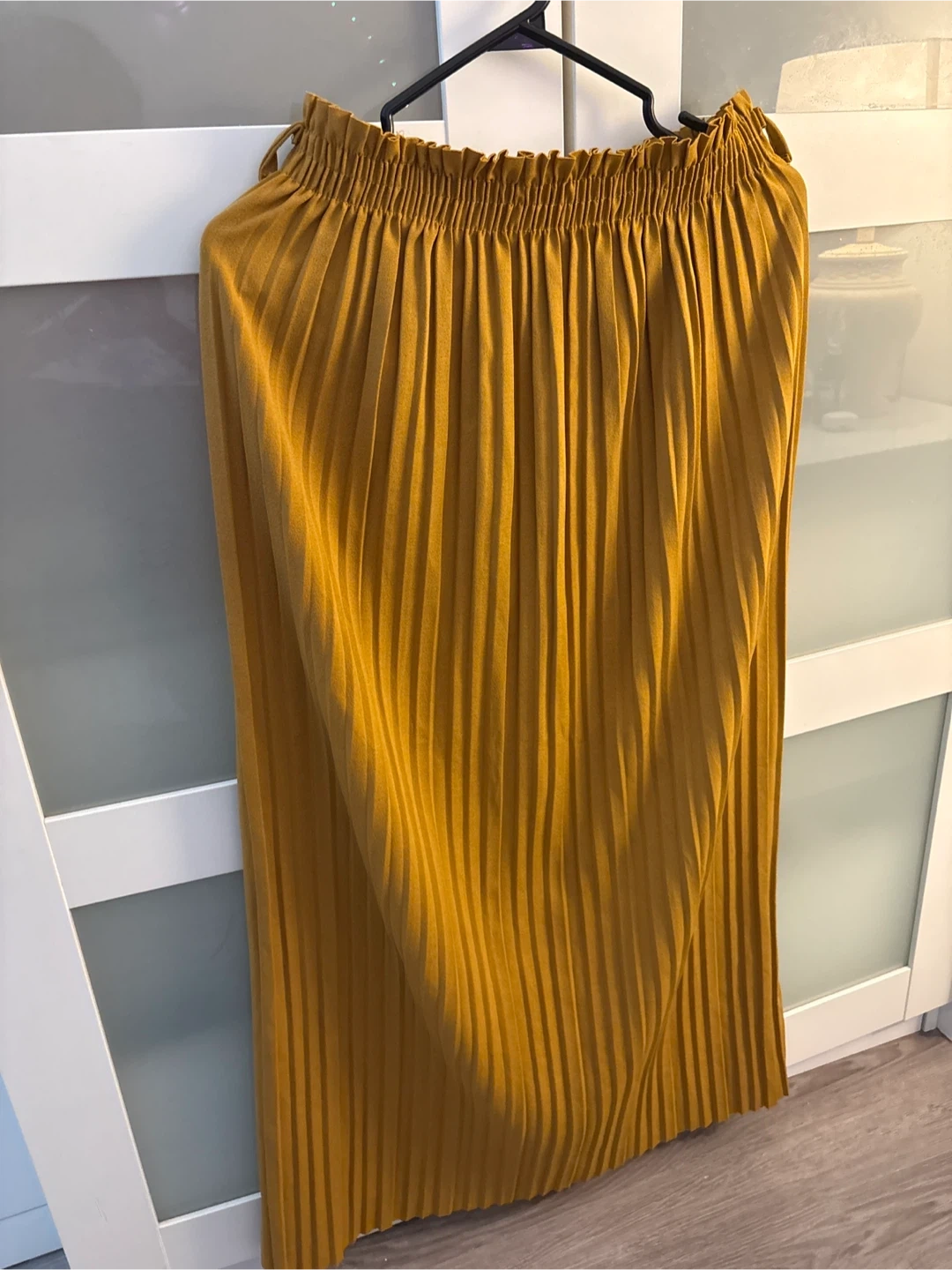 A stylish mustard yellow pleated midi skirt. It features an elastic waistband for comfort. This skirt is made from a flowing fabric.