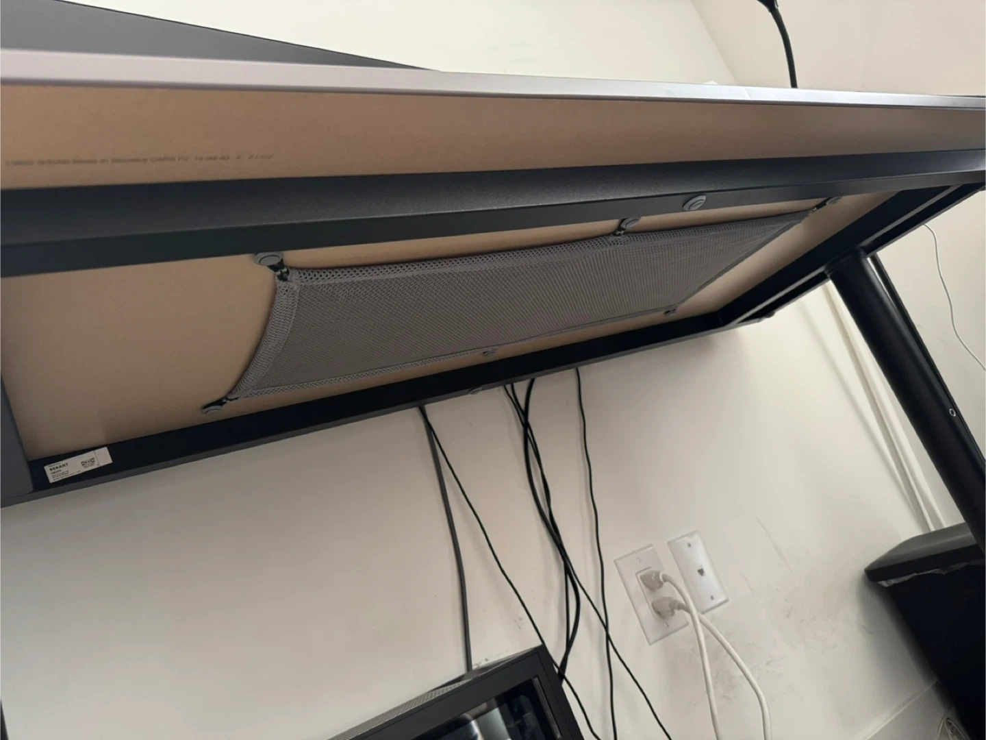 This is a spacious adjustable standing desk. It features a smooth surface for your workstation. The desk's height is adjustable, allowing you to switch between sitting and standing. It's a versatile desk for any home office setup!