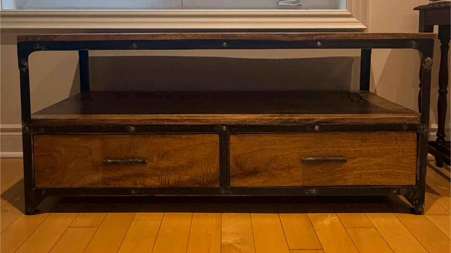 TV stand from Urban Barn. Perfect storage space for media consoles/receivers or decorative items and two drawers. Excellent condition