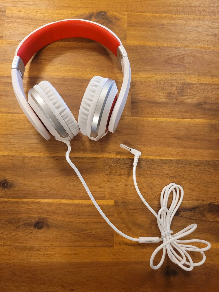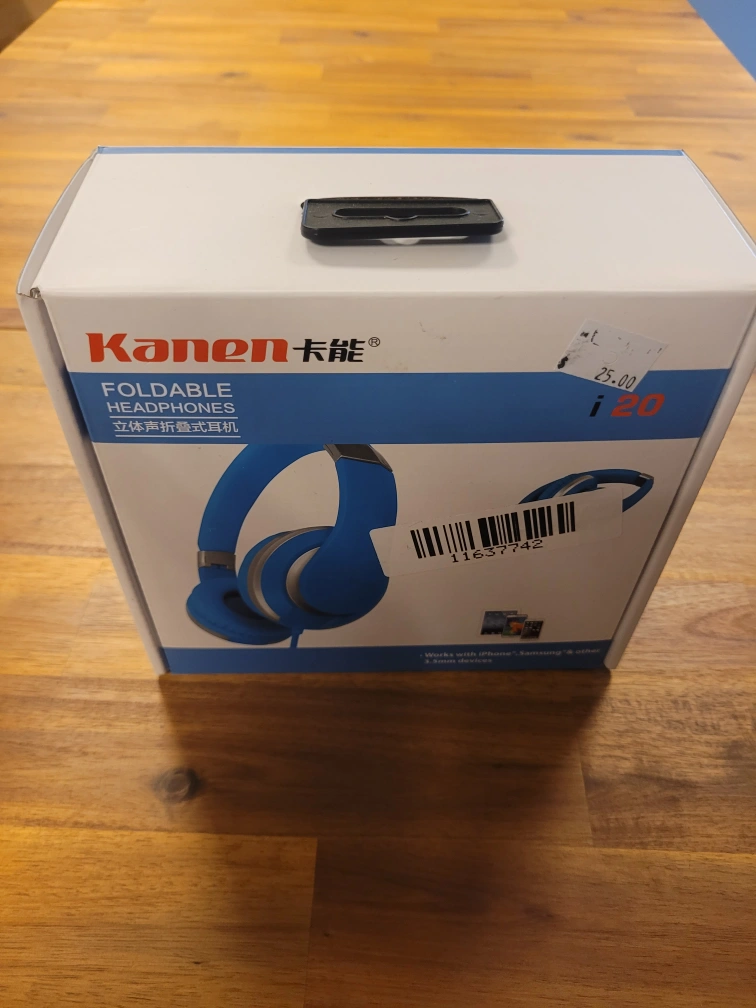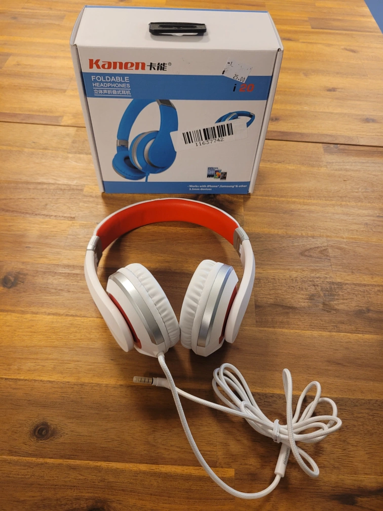 Selling a new pair of Kanon foldable headphones. The headphones are white with red accents. They come with the original box.