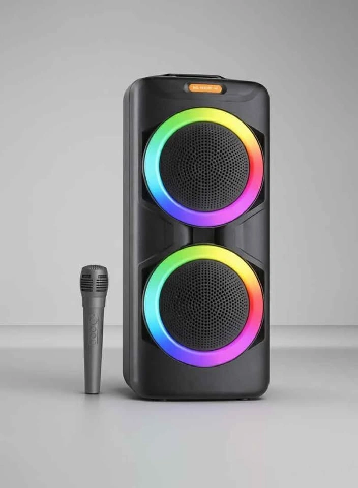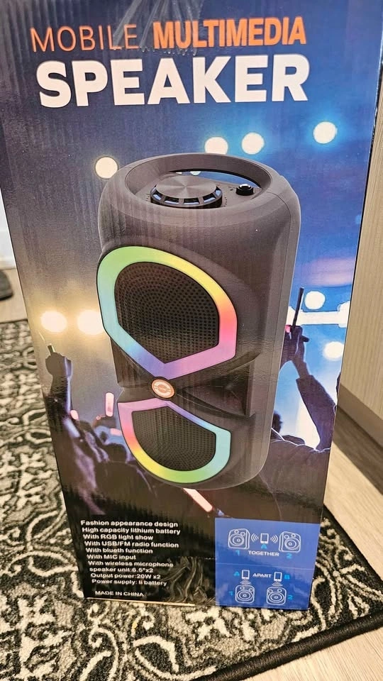 Awesome portable speaker has vibrant LED lights and comes with a microphone. Great for parties or karaoke nights. Connects via Bluetooth.