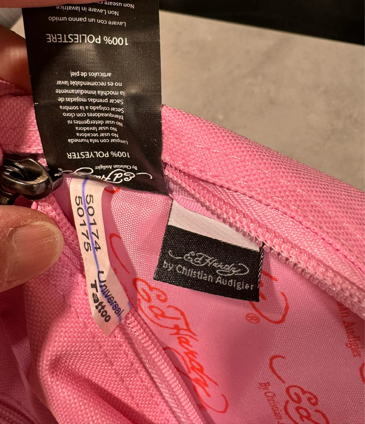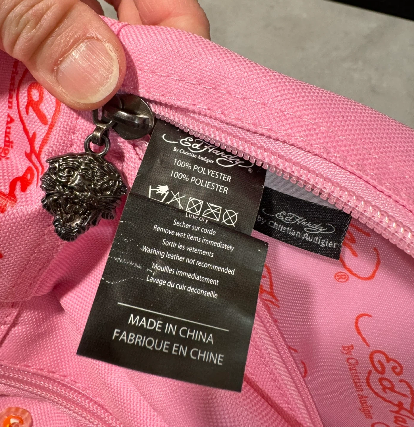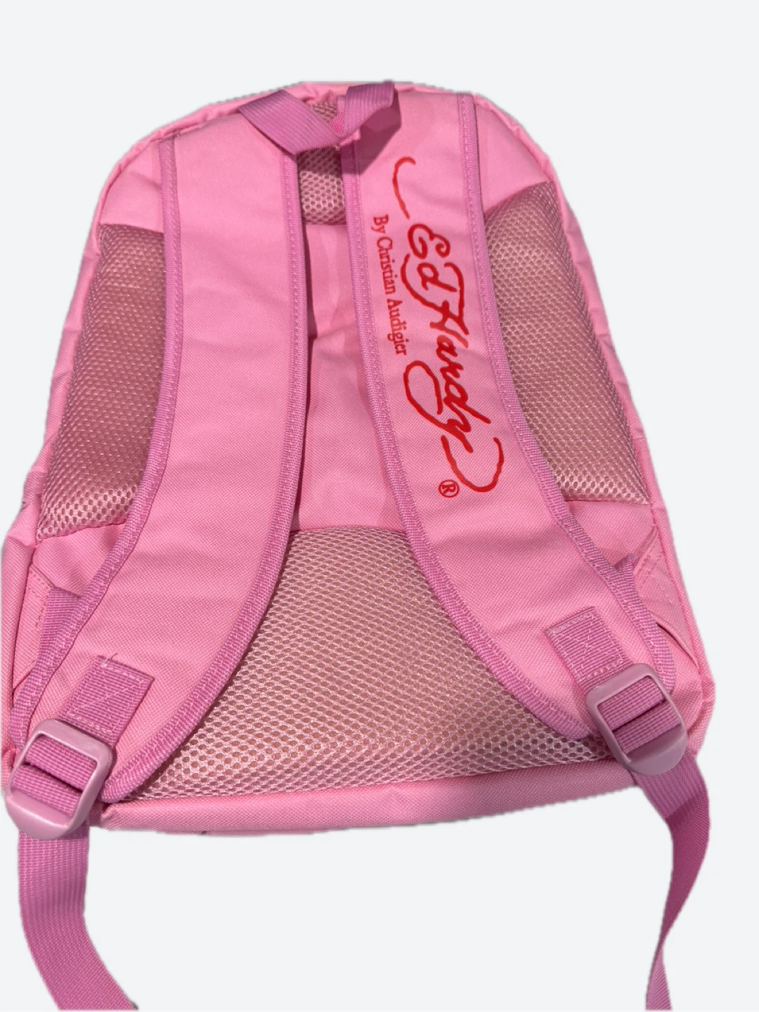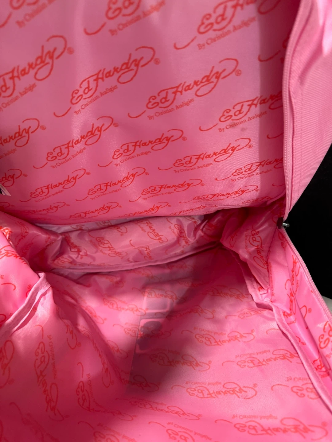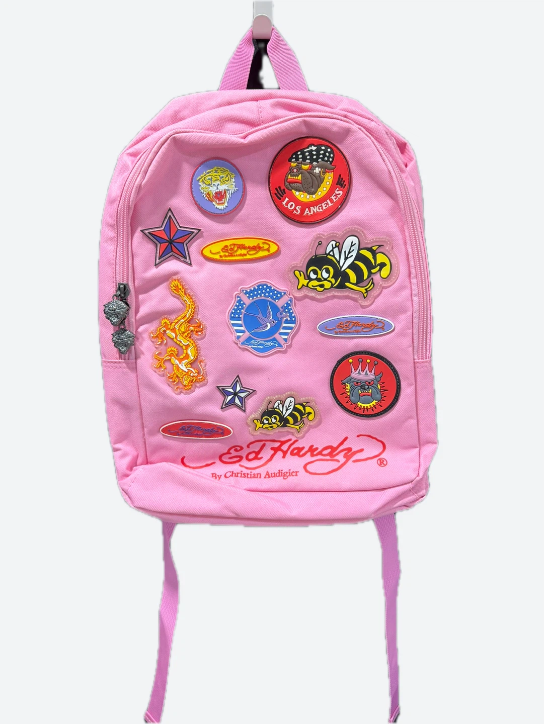 Brand new pink Ed Hardy backpack is adorned with various embroidered patches, including a tiger, bees, and stars.
