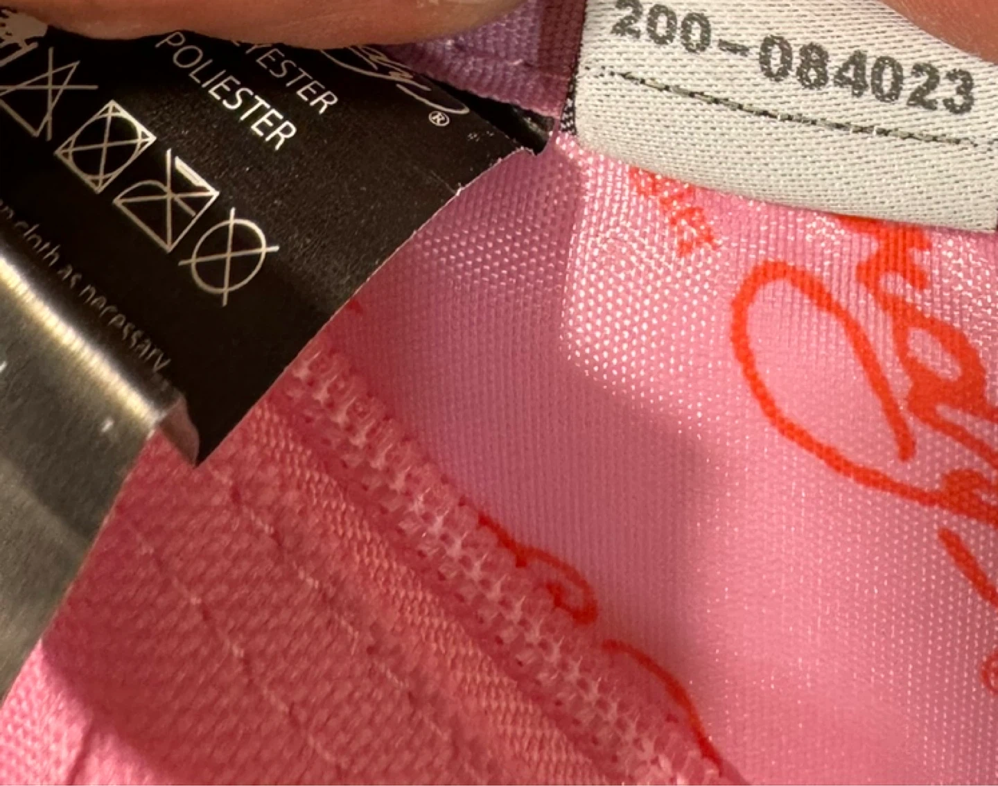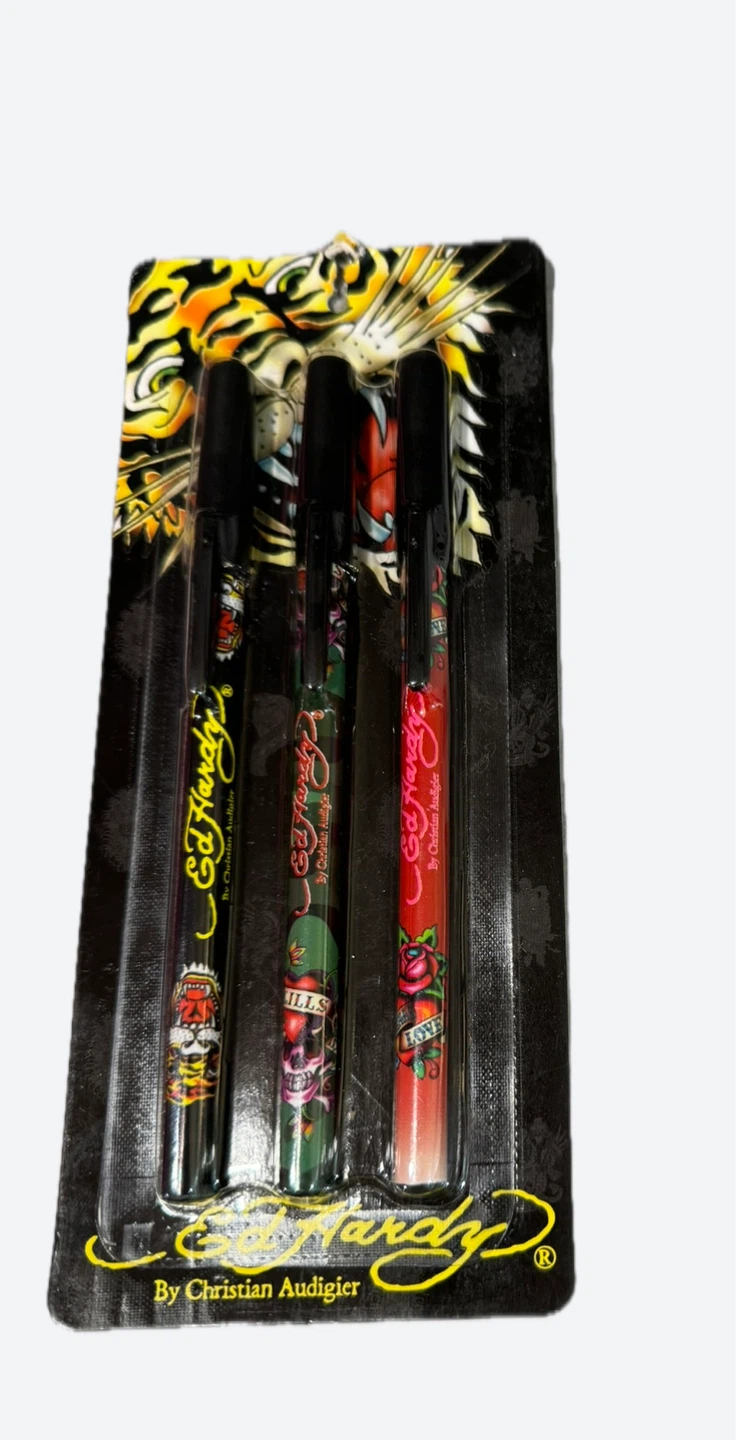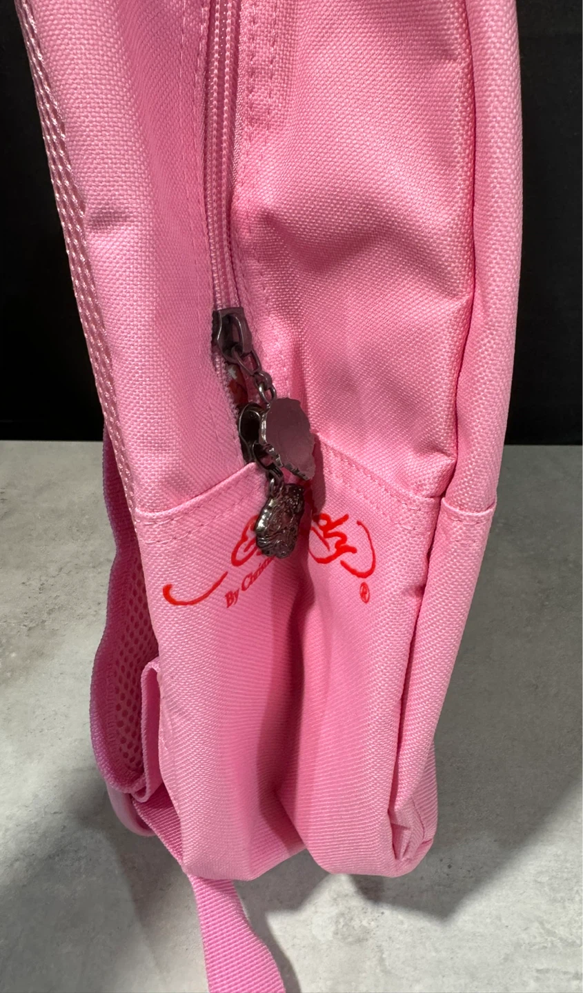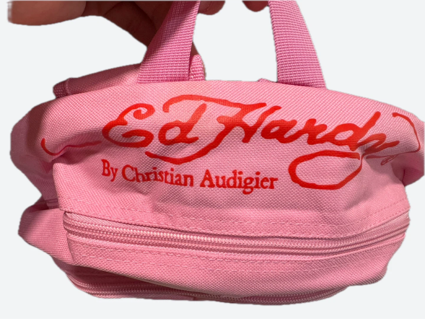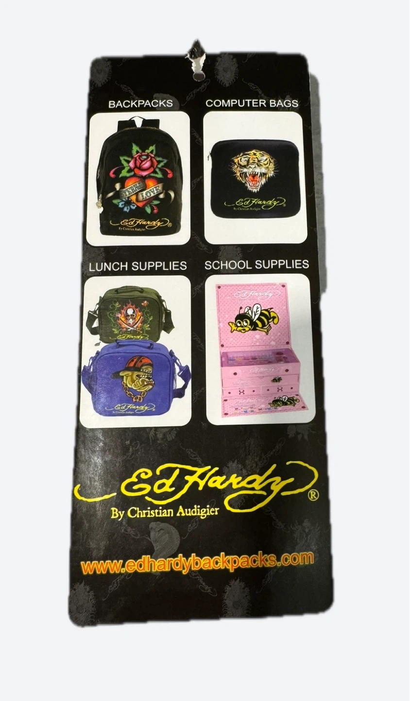 Brand new pink Ed Hardy backpack is adorned with various embroidered patches, including a tiger, bees, and stars.