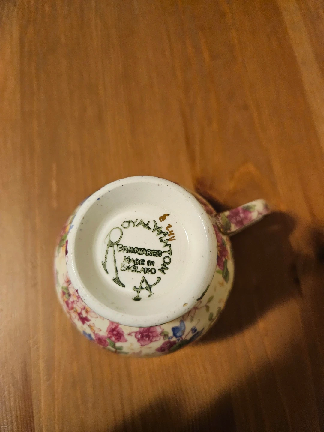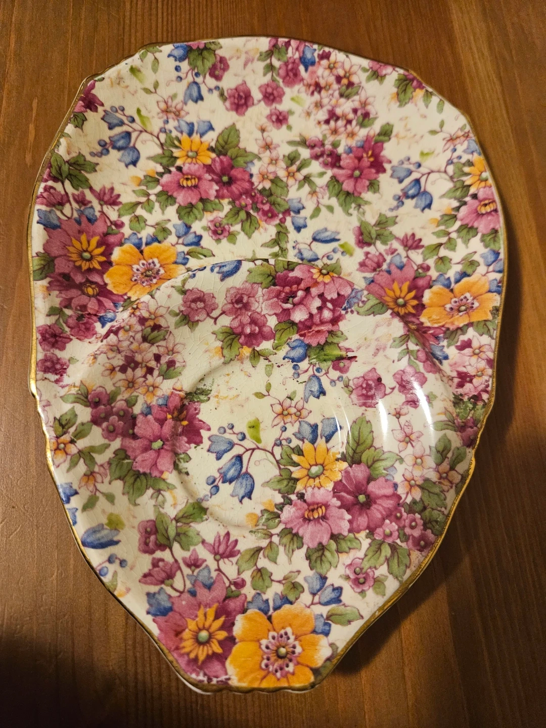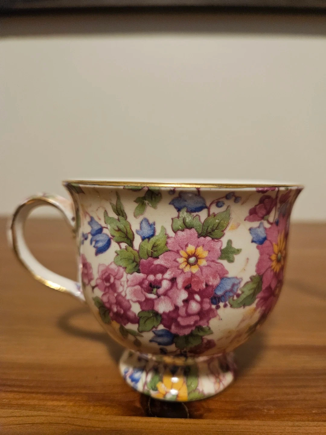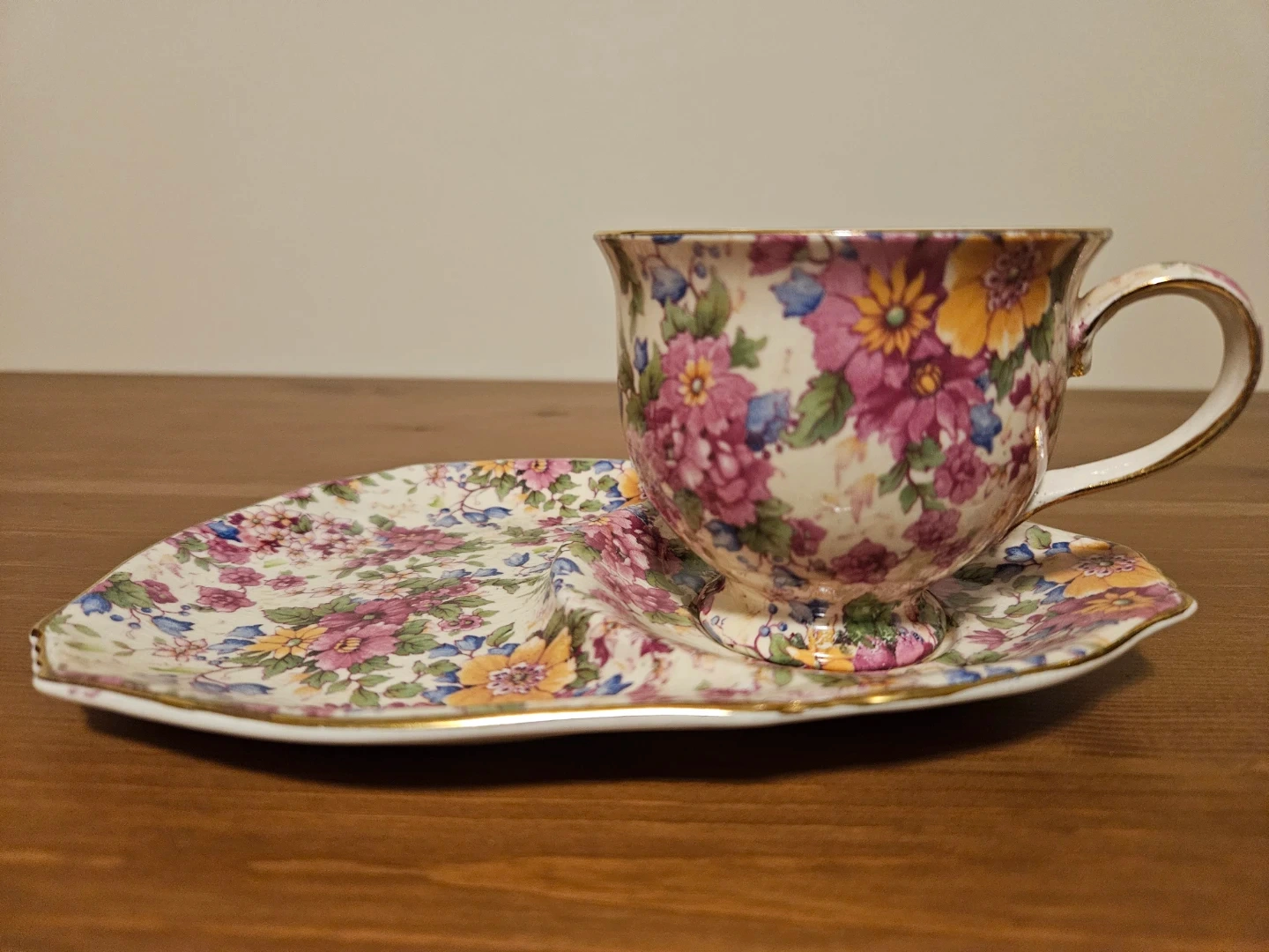 This is a Royal Winton Cheadle chintz tea cup and saucer tennis set in excellent as new condition. It's made in England with a beautiful floral pattern and gold trim. This set is perfect for enjoying a relaxing cup of tea with biscuit.