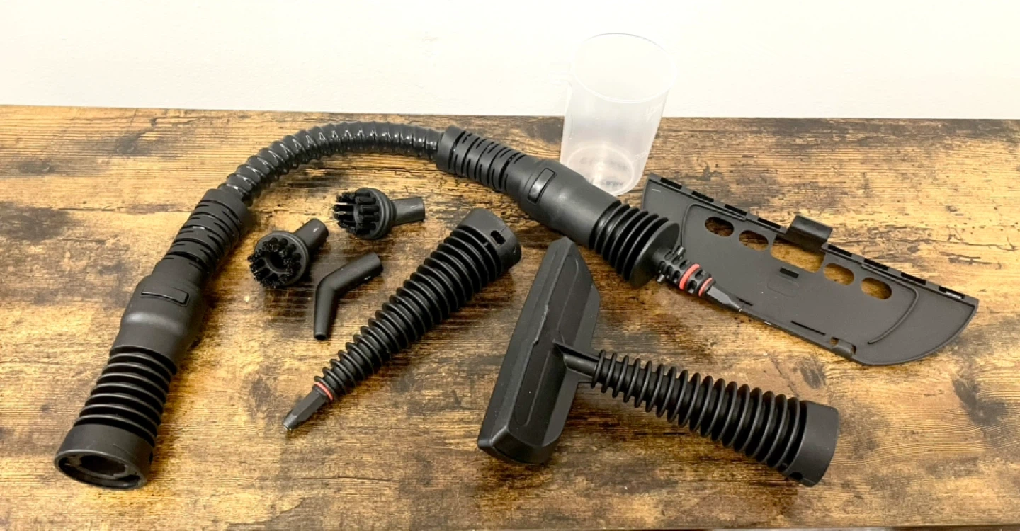 This KOITAT handheld steam cleaner comes with a variety of attachments for different cleaning tasks. It's great for tackling grime and sanitizing surfaces around your home. Attachments include a flexible hose, crevice tool, brush heads, and a floor nozzle adapter.