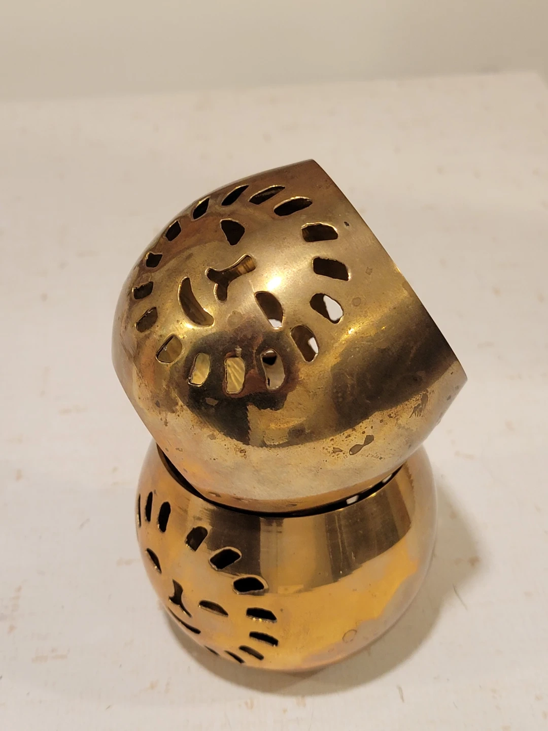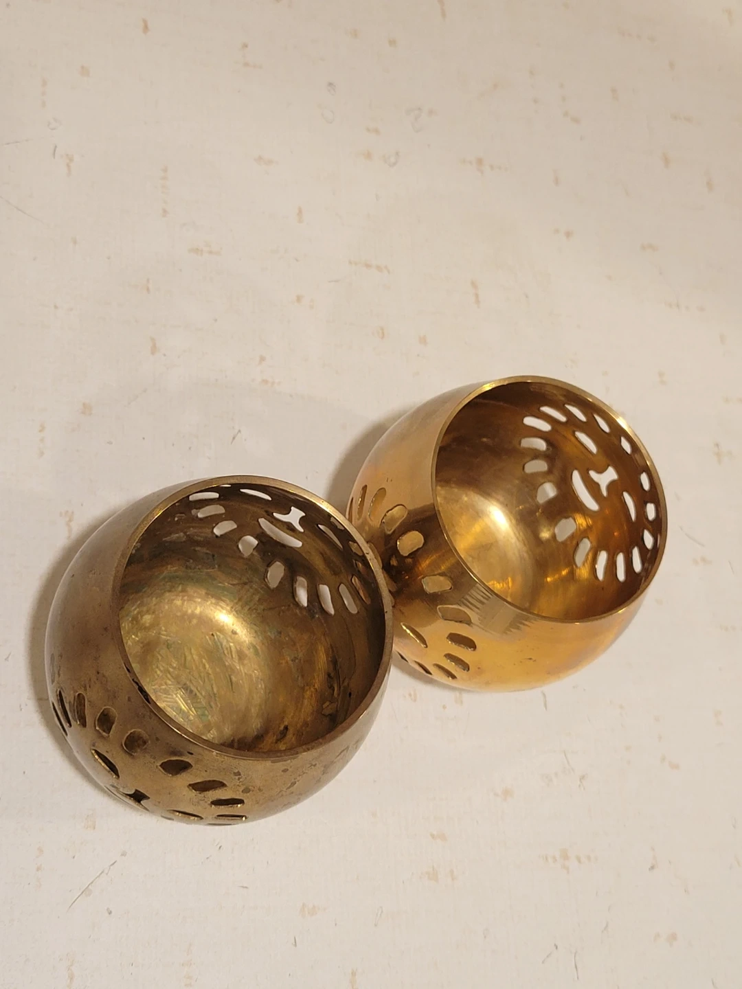 vintage brass tea light holders featuring a unique sun cut-out design. These golden-toned candle holders cast enchanting shadows and bring a warm, inviting glow to any room.