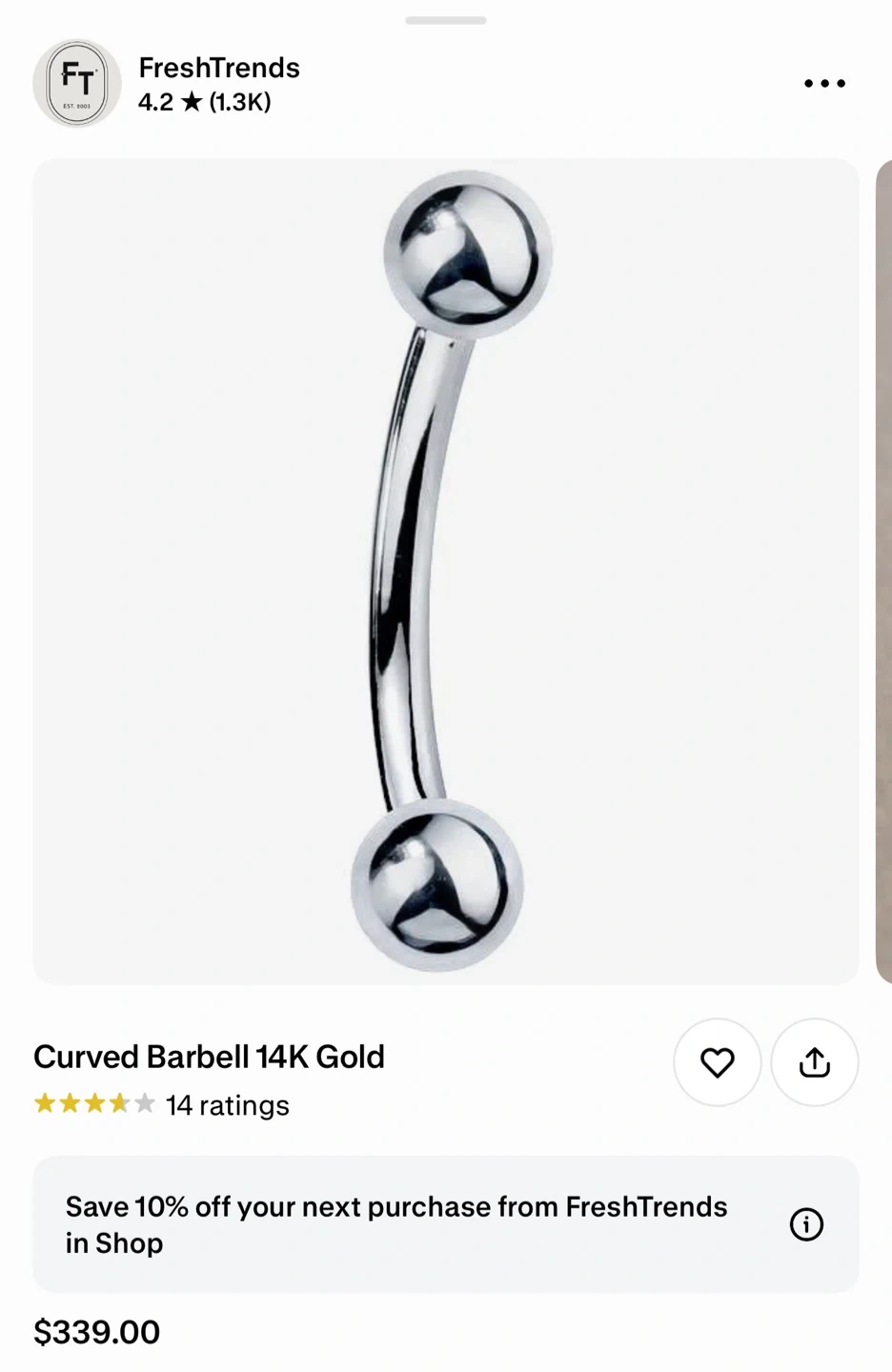 This is a 14K gold curved barbell for eyebrow piercings. It's from FreshTrends fine body jewelry. The barbell has two small balls at each end.