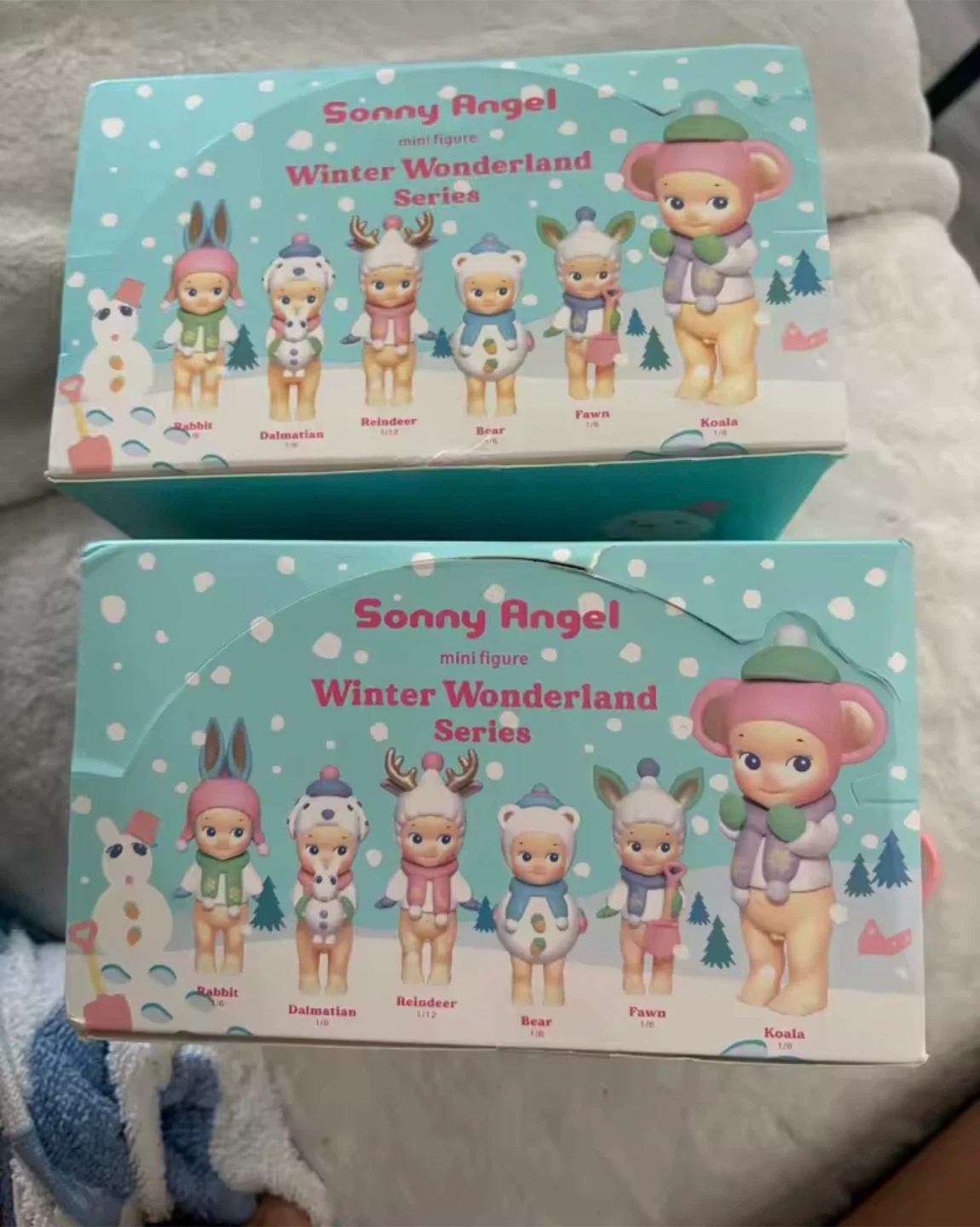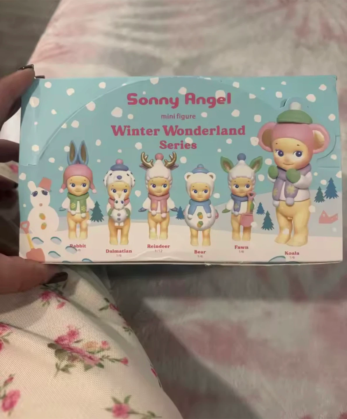 This is a Sonny Angel Winter Wonderland Series mini figure box. It contains 6 blind boxes. The series features cute animal figures like Rabbit, Dalmatian, Reindeer, Bear, Fawn, and Koala. These are collectible figures for fans.